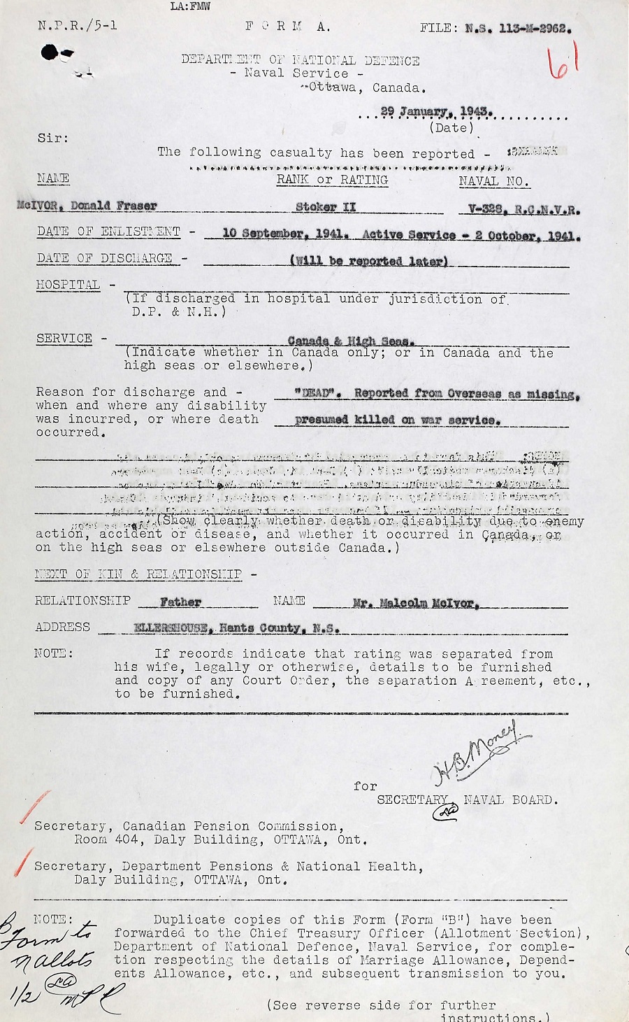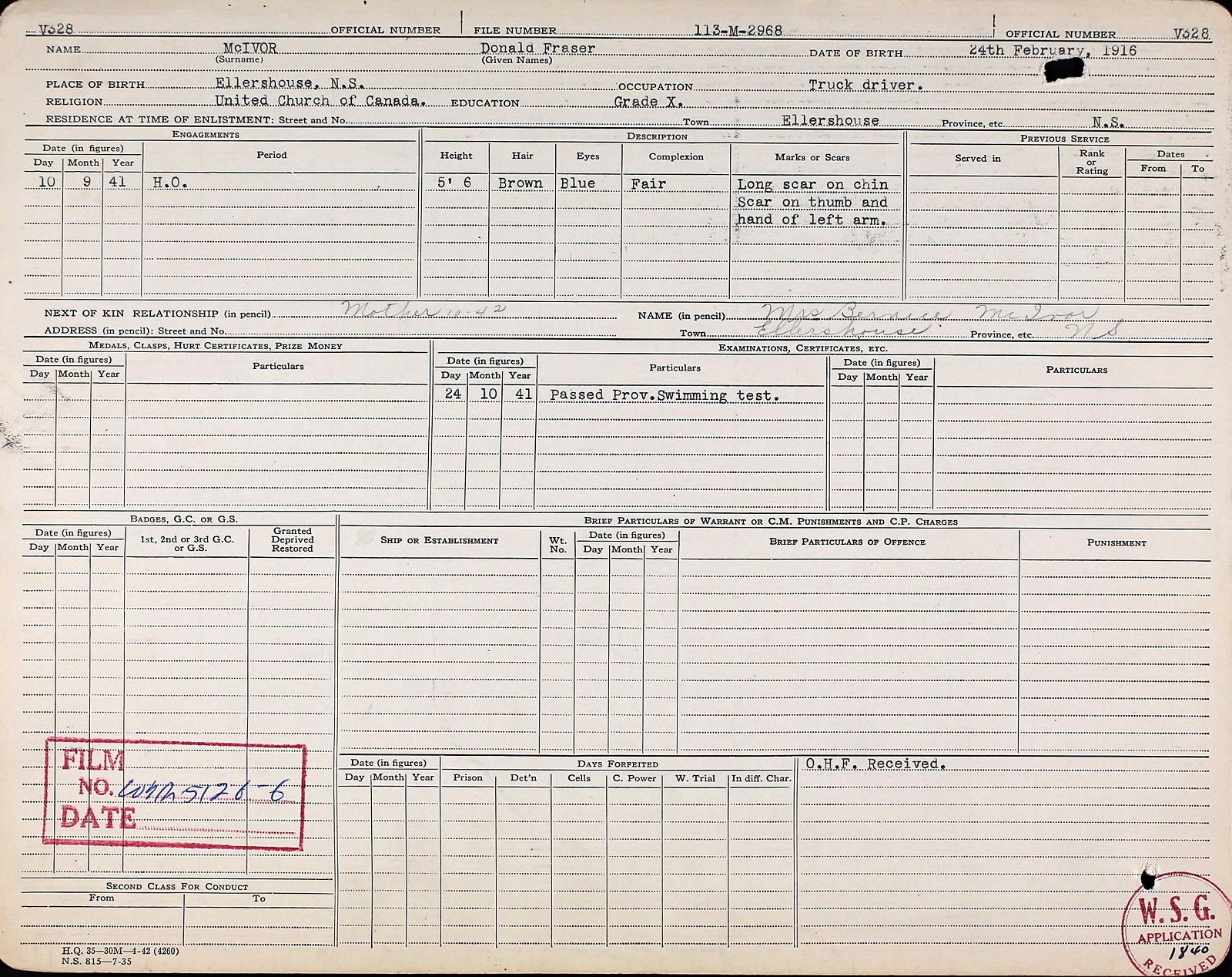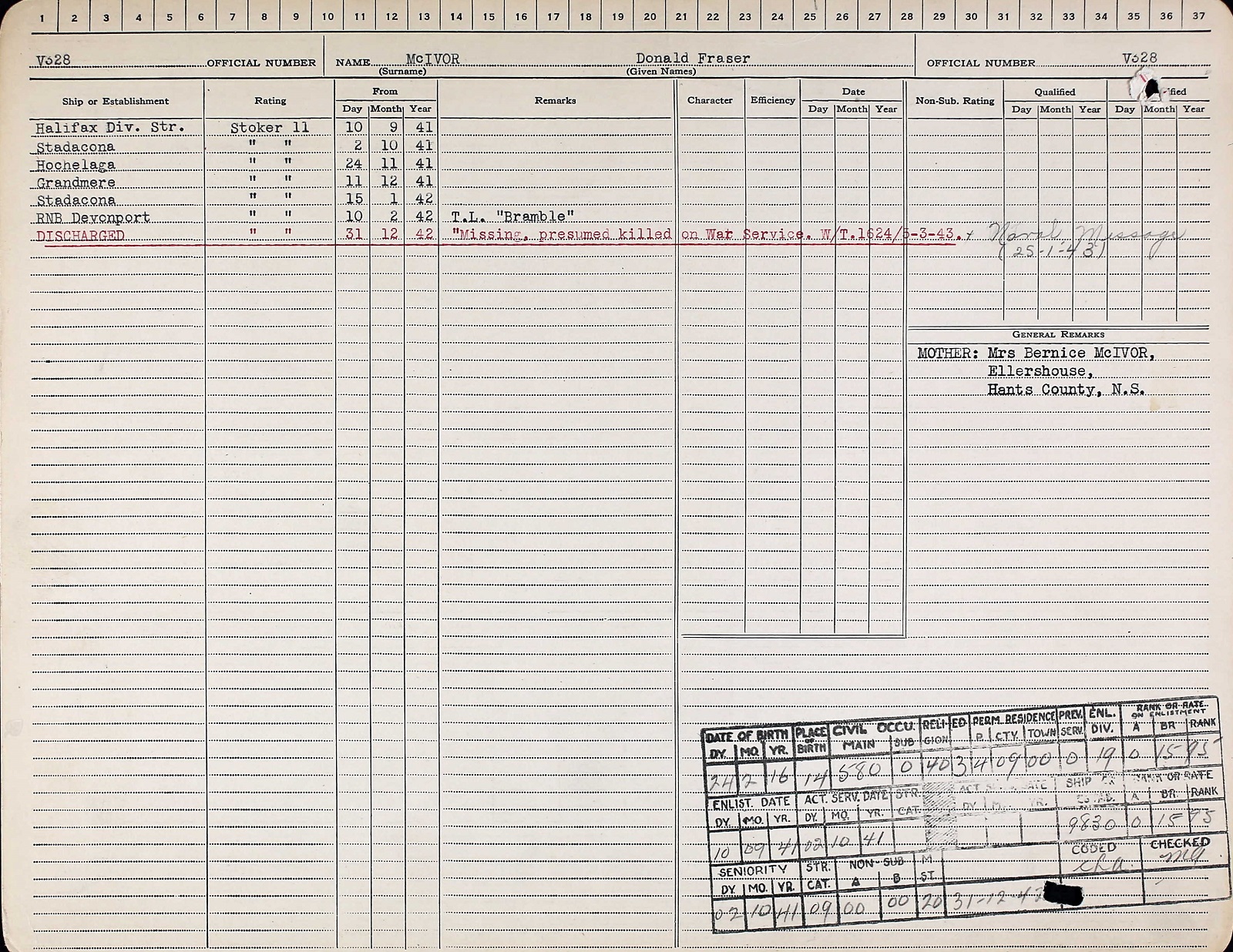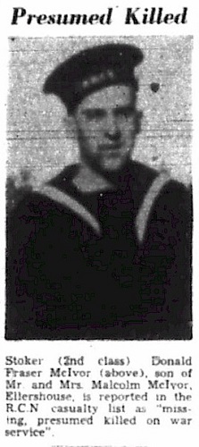McIVOR, Donald Fraser, Sto 2c, RCNVR, MPK - 31 Dec 1942, HMS BRAMBLE - son of Malcolm and Bernice L. McIvor, of Ellershouse, NS.