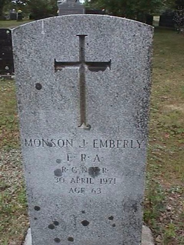 EMBERLY, Monson James - 83, of Dayspring, Lunenburg County died Friday at the Victoria General Hospital, Halifax. Born in Springhill, he was a son of the late Mr. and Mrs. John Emberly. He is survived by his wife, Doris (Langille); two daughters, Charlotte (Mrs. Charles Jenkins), Labrador; Doris (Mrs. Arthur Veinotte), Dayspring; two sons, George, First South; John, Bridgewater; two brothers, John Halifax; Harry, Spryfield; two sisters, Mable (Mrs. George Murray), and Bessie (Mrs. George MacDonald), both of Halifax; his step-father, George Jollymore; two step-brothers, Frank and Roy, Jollimore; two step-sisters, Mrs. A. Dawson, Halifax; Florence, Ontario; and five grandchildren. Funeral service will be held today at two p.m., in St. Paul's Lutheran Church, Bridgewater. Burial will be in the family plot, Dayspring. (Halifax Chronicle-Herald Monday, 03 May 1971)