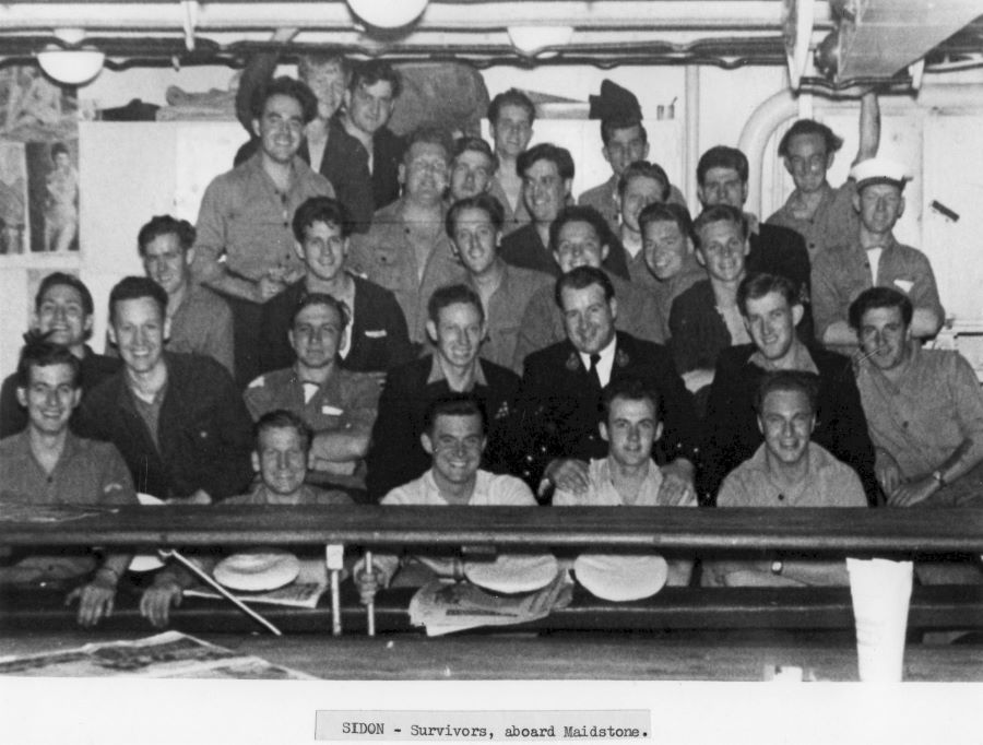 Survivors of the torpedo explosion on HMS SIDON aboard HMS MAIDSTONE Sam Jennings, RCN 2nd row, 2nd from left Jean Claude Gourdeau, RCN, was also on board SIDON, but is not identified in the photo