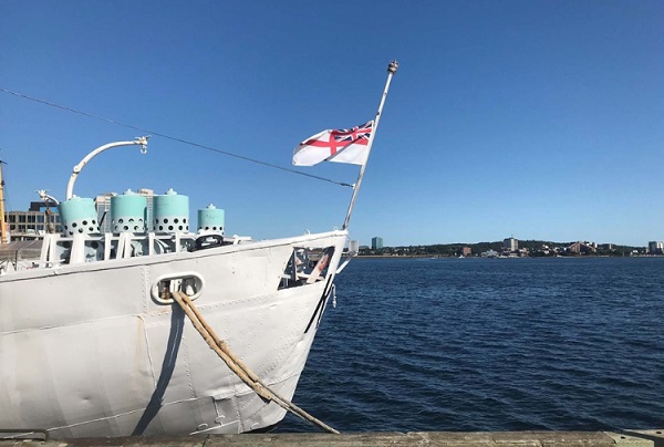 HMCS SACKVILLE'S Ensign flies at half-mast to mark the passing of LCdr Jim Reddy (ret'd), CO, HMCS SACKVILLE 25 Aug 2019