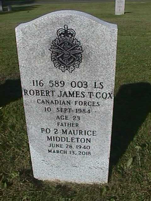Headstone of LS Robert Cox and his father P2ER Maurice Middleton in the Fort Massey Cemetery, Halifax, NS