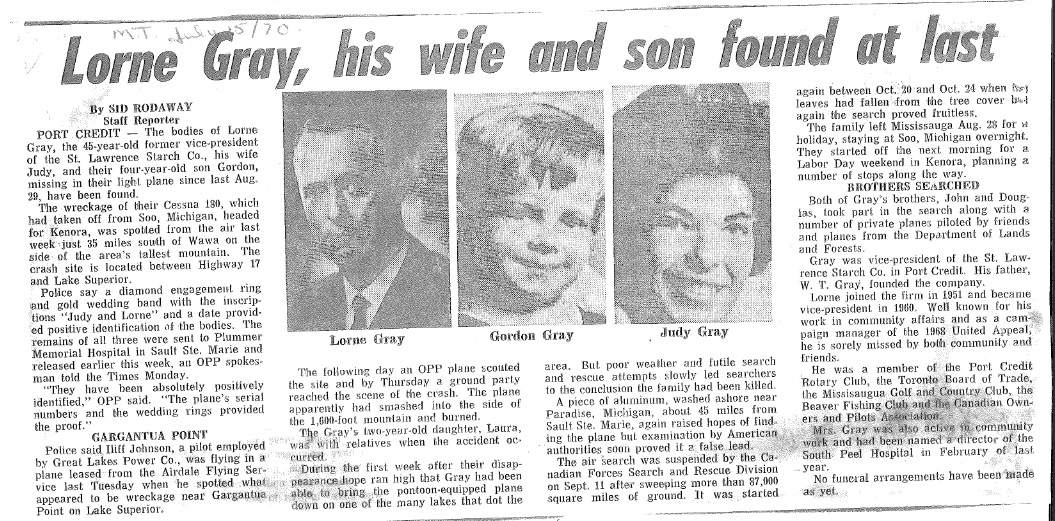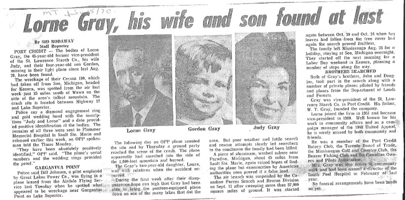 Lorne Gray, his wife Judy and son Gordon died when their plane crashed near Gargantua Point, Ontario on 29 Aug 1969.