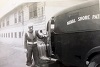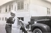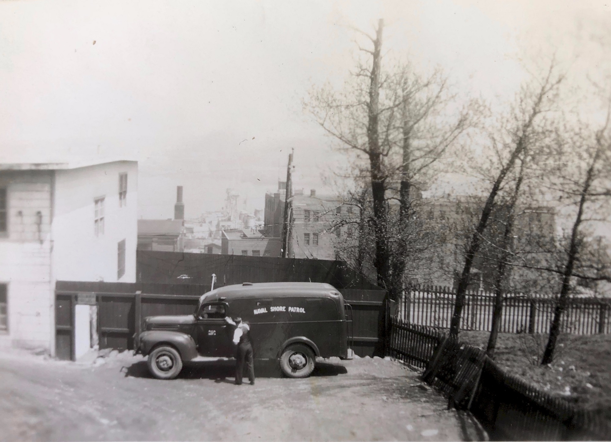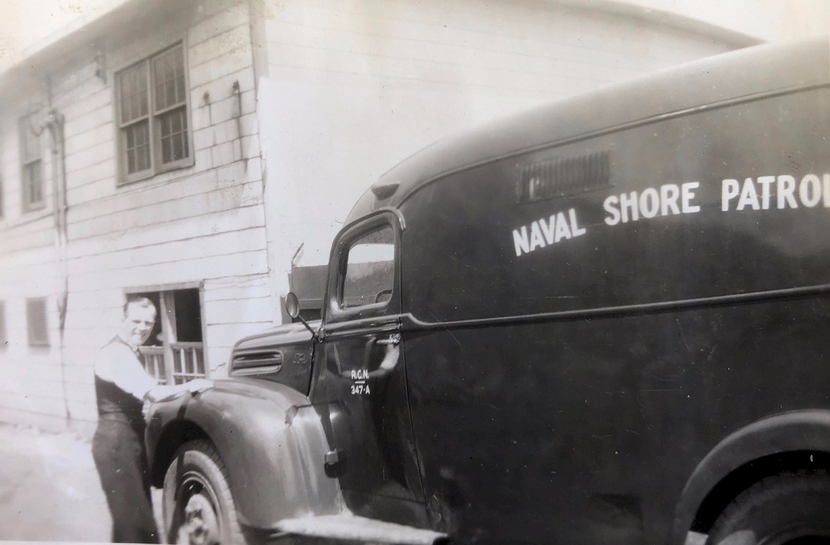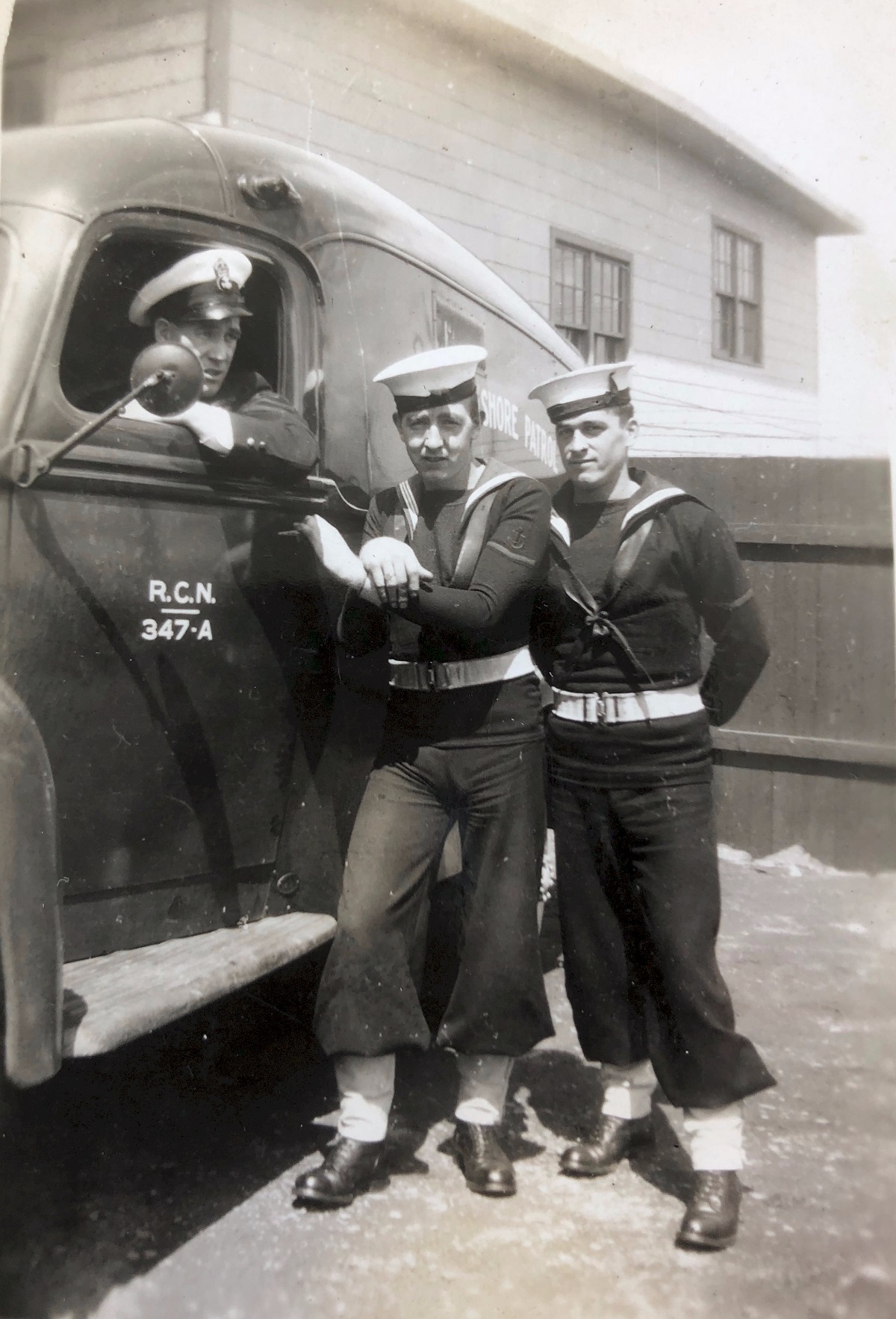 (8) Shore Patrol - Elvin McLean top right (9) Shore Patrol (10 ) Shore Patrol compound overlooking HMC Dockyard, Halifax. Two Castle Class Corvettes in background (11) Unidentified person cleaning shore patrol vehicle (12) Unidentified sailor by shore patrol vehicle (13) Unidentified sailors jacking around with bat for the camera (webmaster's note: I'm sure some of them wished they were able to use a bat when on patrol) (14) Shore Patrol - Elvin McLean on left