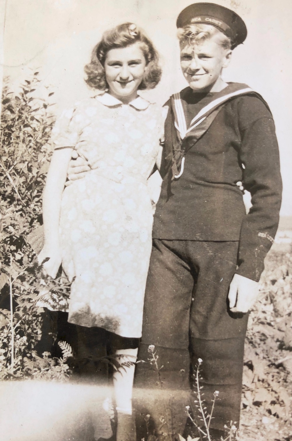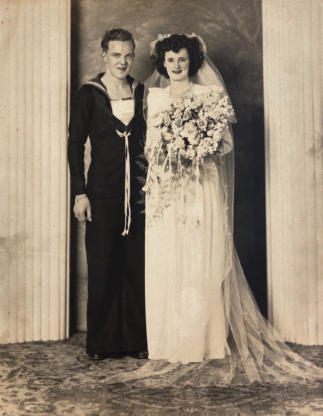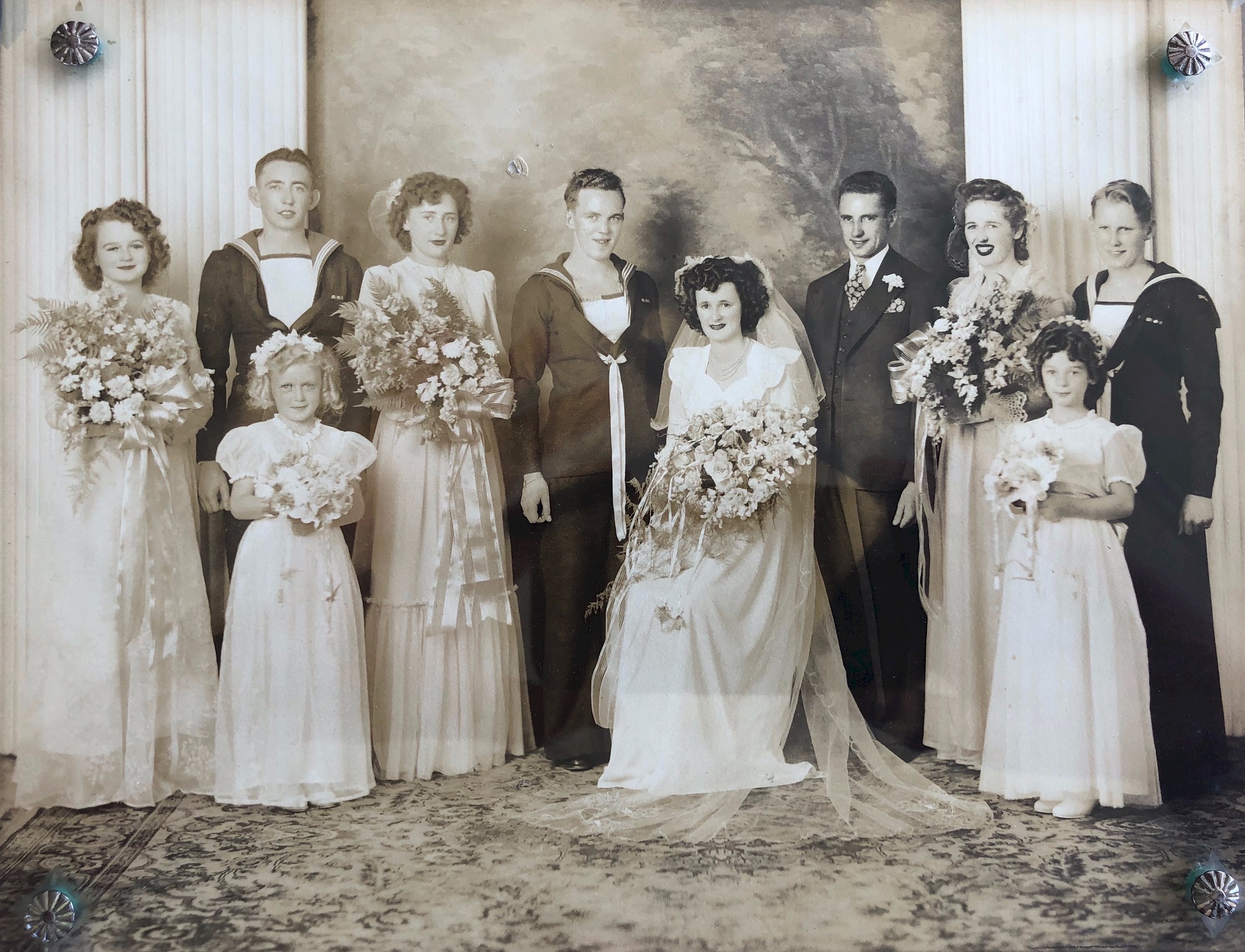 (1) Elvin and Audrey McLean on their wedding day (2) Elvin and Audrey's wedding party (3) Elvin McLean (4) Elvin McLean (left) and unidentified sailor (5) Elvin McLean on either HMCS CHAMBLY OR HMCS LOUISBURG (6) Elvin McLean by unknown monument (7) WW2 song book