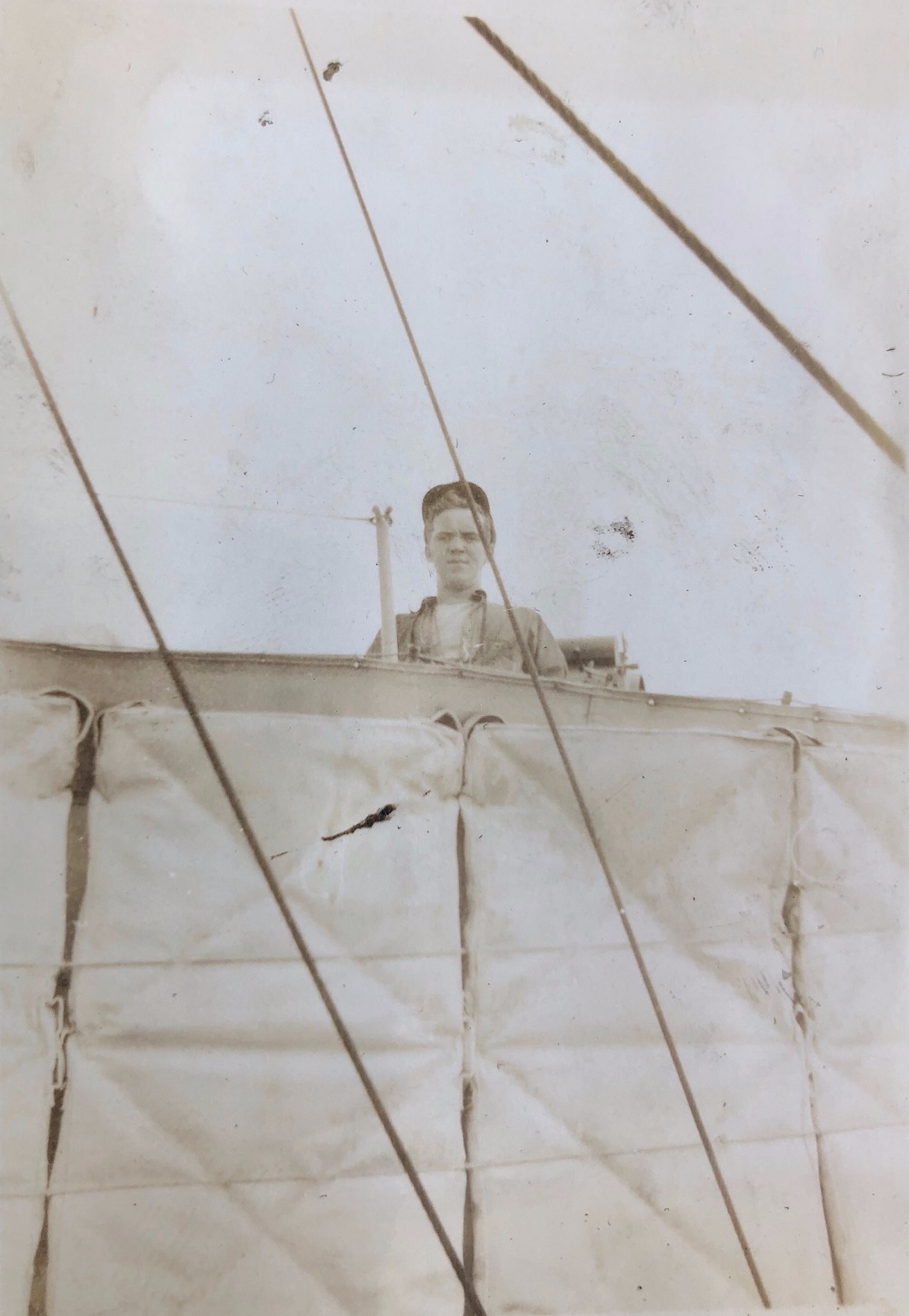 (15) Sailors in ship's boat. Elvin McLean identified by arrow (16) Unknown young couple. Cap tally and left sleeve says "Sea Cadet" (17) Ships in unknown port - possibly St. John's, Nfld (18) Unidentified sailors jacking around (19) Unknown person - looks to be wearing a train engineer or conductor's cap (20) Sailors on unknown ship - sailor in foreground has monkey on his shoulder (21) Sailors on unknown ship - sailor front row centre holding a mandolin (22) Unknown group of sailors - uniforms look like those worn by Combined Operations personnel