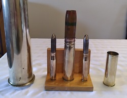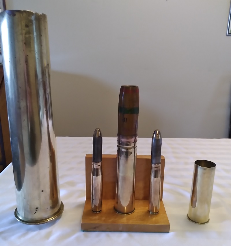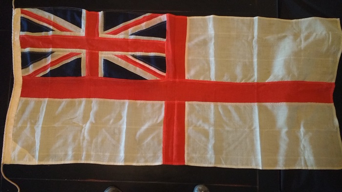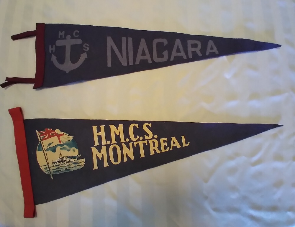 (KM05) White Ensign that Ken Martin brought home after the war - 6 ft in length (KM06) Shell cartridges that Ken Martin saved as souvenirs from his time in the navy (KM07) Souvenir ship pennants from HMCS NIAGARA and HMCS MONTREAL