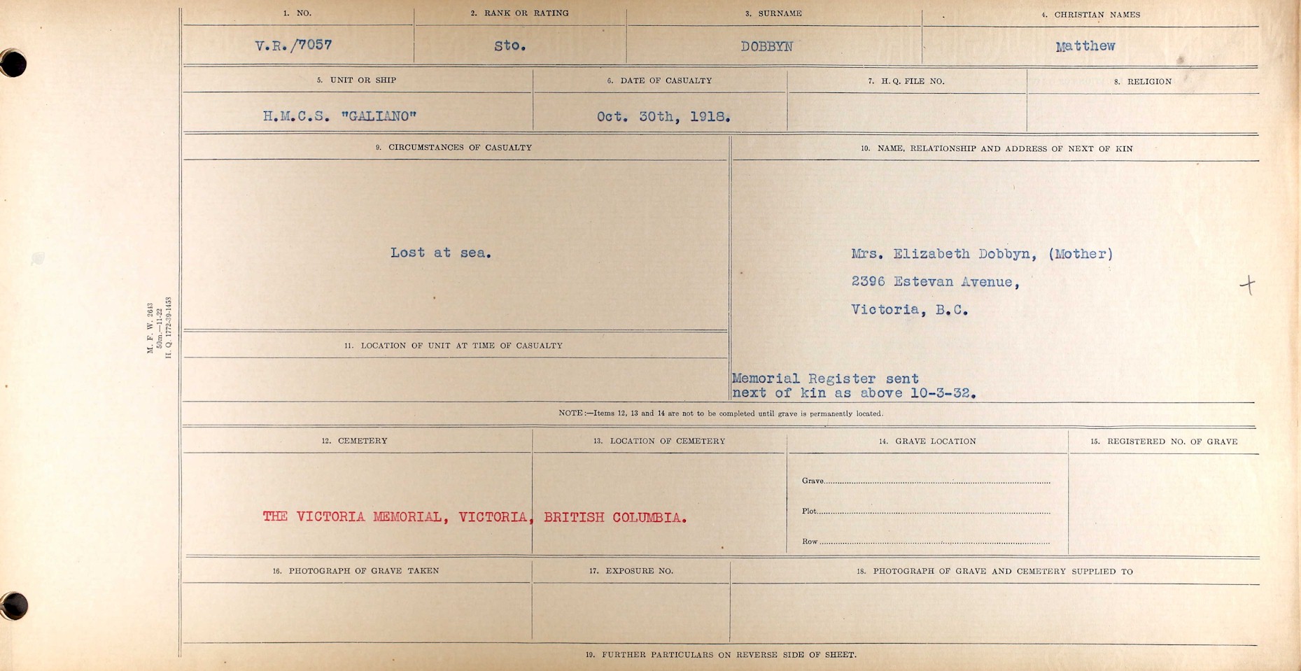 Matthew Dobbyn is listed on the Victoria Memorial in the Ross Bay Cemetery on Vancouver Island, BC
