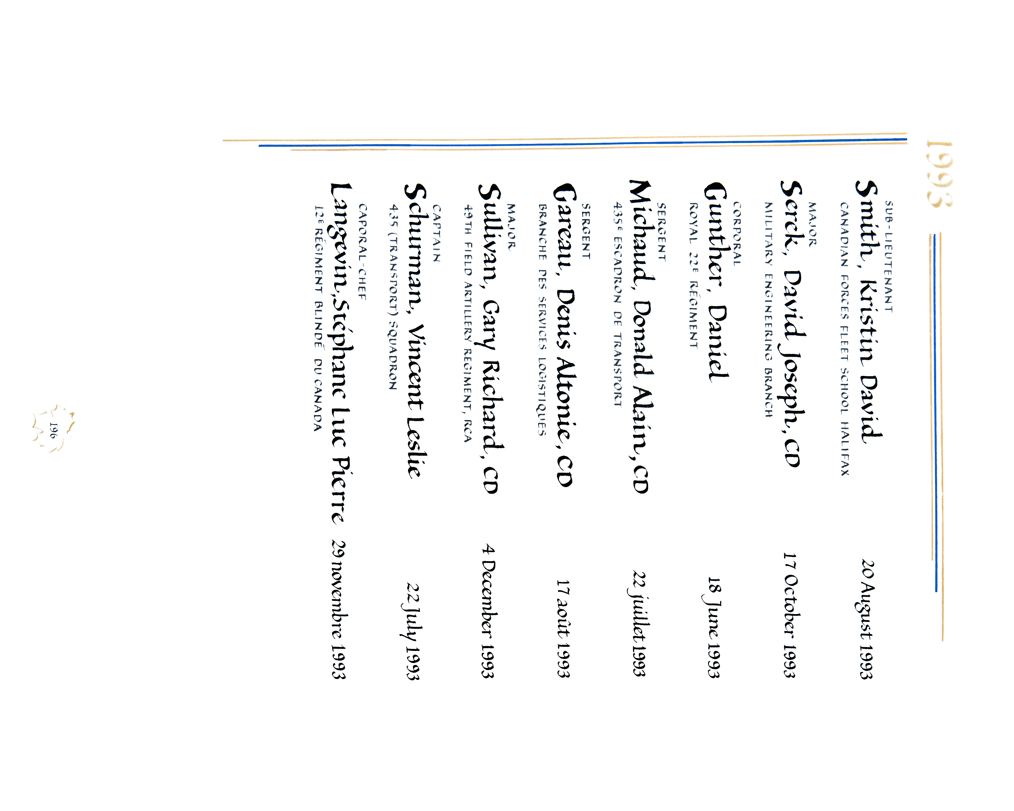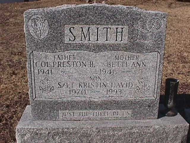 SMITH, Kristin David - 23, Halifax and North Bay, Ont., died August 19, 1993, as the result of a mountain climbing accident on Cathedral Ledge, North Conley, N.H. Born in Hull, P.Q., he was the only child of Col. Preston R. and Betti Ann Smith, Colorado Springs, Colo. He graduated from Tantallon Junior High School in June 1984 and from Widdifield High School, North Bay in June 1988. He graduated in May 1992 with a bachelor degree in computer engineering from the Royal Military College of Canada, Kingston. He was attending naval training at the Technical University of Nova Scotia and the Canadian Forces Fleet School at CFB Halifax. He was an avid and experienced mountain climber, runner, skier, cyclist, scuba diver and all around superb athlete. He was also an artist, author, historian, lover of music and student humanity. He is survived by his paternal grandfather, Guy Preston, Balmoral, N.B.; an aunt and uncle; two cousins; numerous paternal great-aunts and uncles; a maternal great-aunt. Cremation has taken place. A memorial service will be 10 a.m. Thursday in St. George's Anglican Church, Head of St. Margaret's Bay, Rev. Capt. Robert Brinn and Padre Charlie Beck officiating. Burial will be in parish cemetery. In lieu of flowers, donations may be made to Terry Fox Marathon of Hope Foundation. (Halifax Chronicle-Herald, Wednesday 25 Aug 1993)