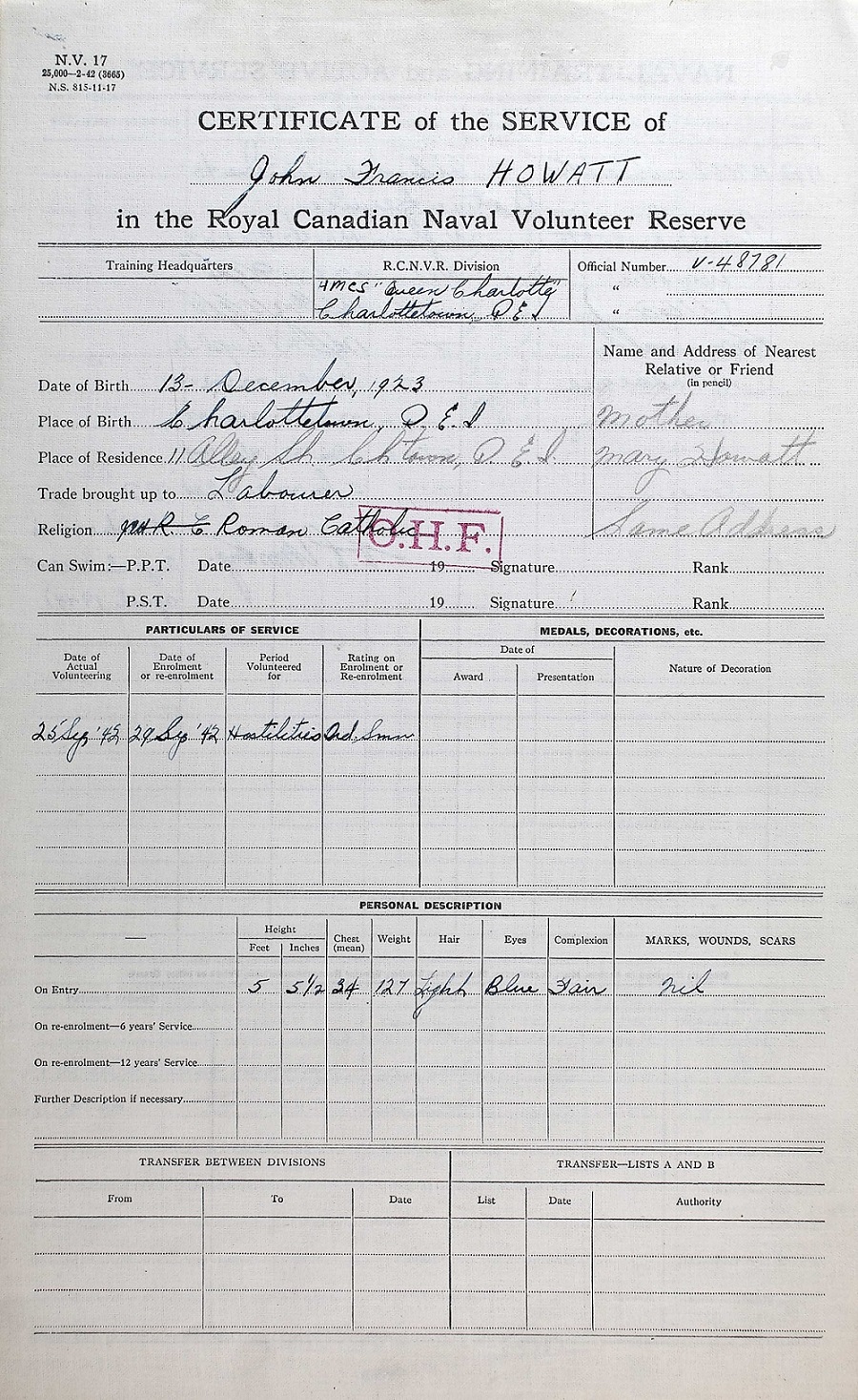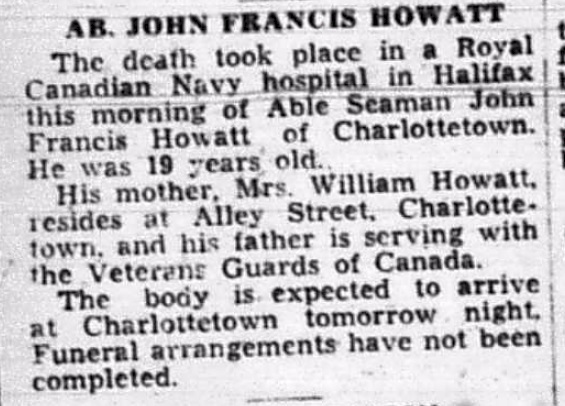 HOWATT, John Francis, AB, V48781, RCNVR - died 20 Apr 1944, RCN Hospital, Halifax - son of William and Mary Howatt, Charlottetown, PEI. AB Howatt died of a cerebral hemorrhage. He is buried at the St. Dunstan's Cemetery, Charlottetown, PEI