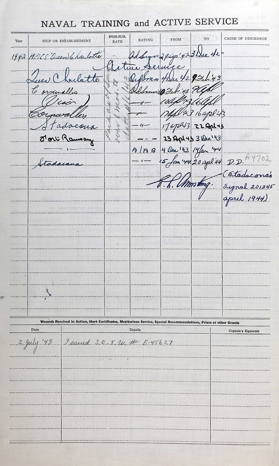 Ships served in: HMCS QUEEN CHARLOTTE - Enlisted 24 Sep 1943. Commenced active service 04 Dec 1942 HMCS VISON - Served in Vison 10 Apr 1943 - 16 Apr 1943 while in training at HMCS Cornwallis