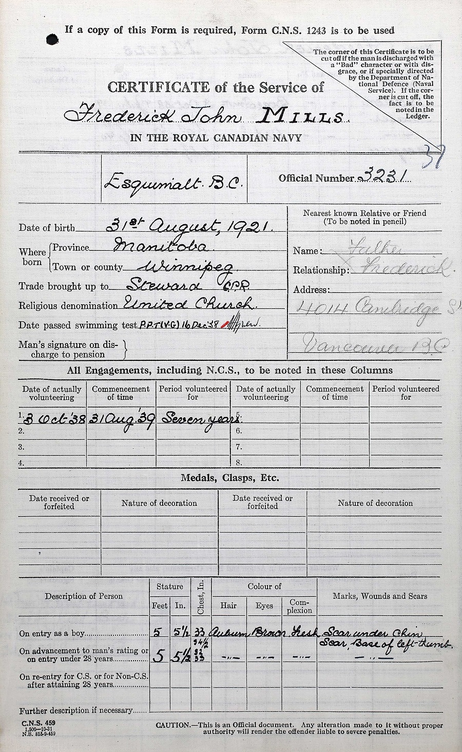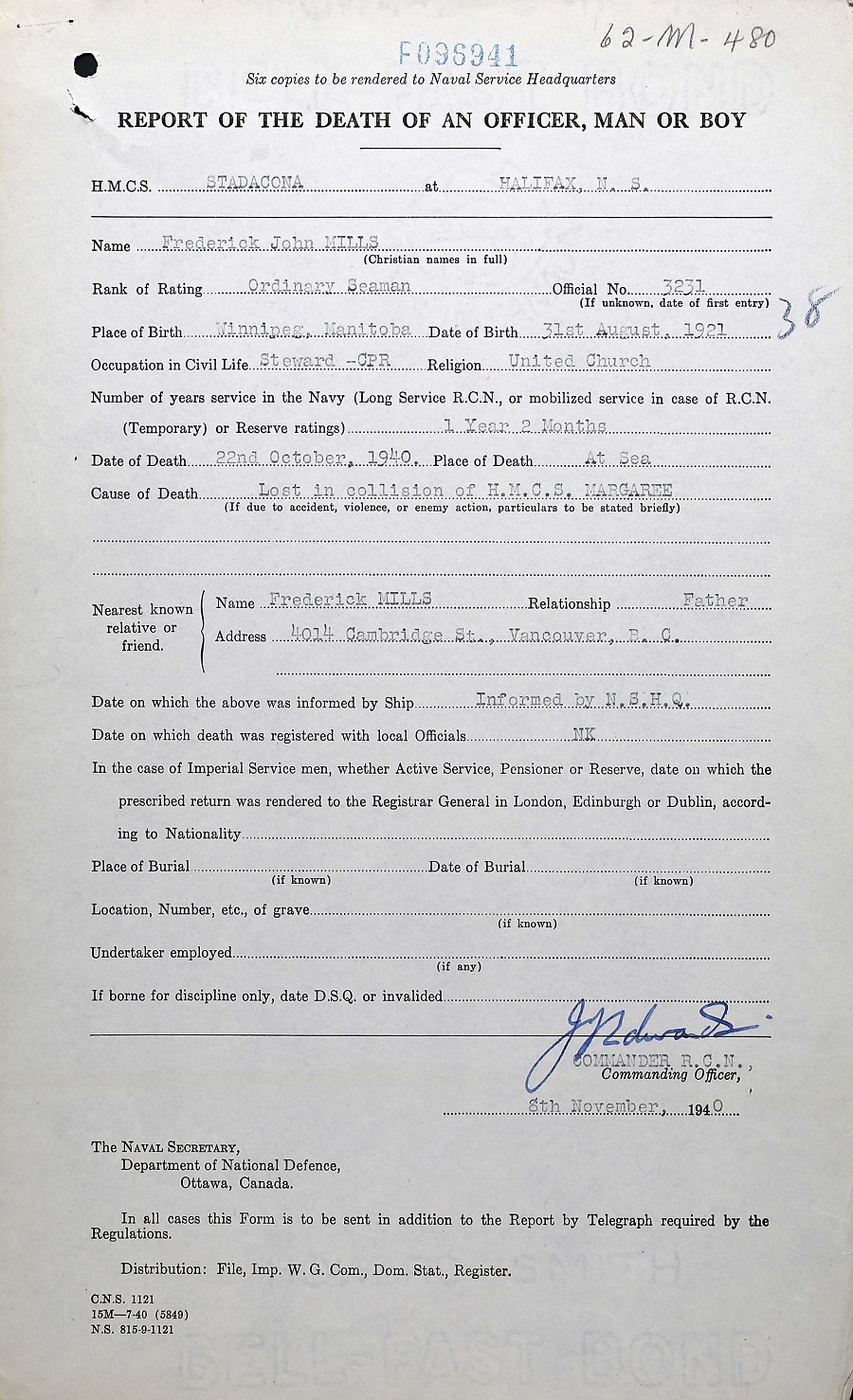 MILLS, Frederick John, OS, 3231, RCN, MPK - 22 Oct 1940, HMCS MARGAREE - Born 31 Aug 1921 son of Frederick Charles and Margaret Mills; brother of Allan MacLean, Albert Edward and Margaret Mary Mill, all of Vancouver, BC.