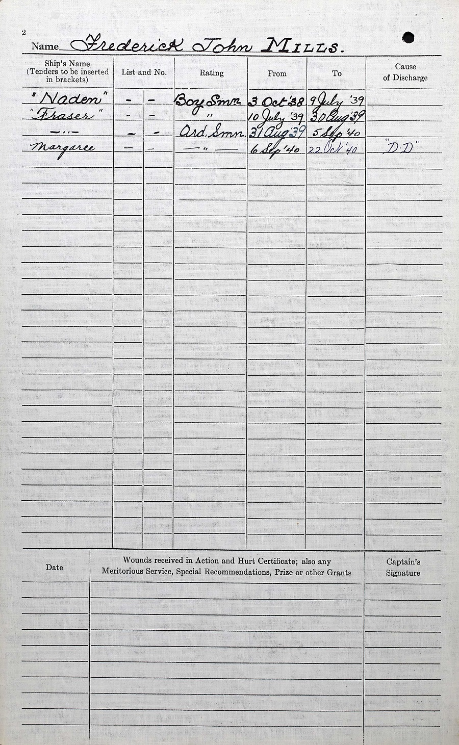 Ordinary Seaman Mills died when his ship, HMCS MARGAREE, was struck by the freighter SS Port Fairy while in convoy and was sunk. 143 of her crew were lost, 86 of them were survivors of HMCS FRASER.