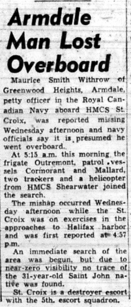 WITHROW, Maurice Smith, PO1, 23407-H, RCN, died - 17 May 1961, HMCS ST CROIX - Son of Maurice and Lillian Withrow of Saint John, New Brunswick. Husband of Shirley Withrow of Armdale, Nova Scotia. Brother of James, Herbert and George Withrow.