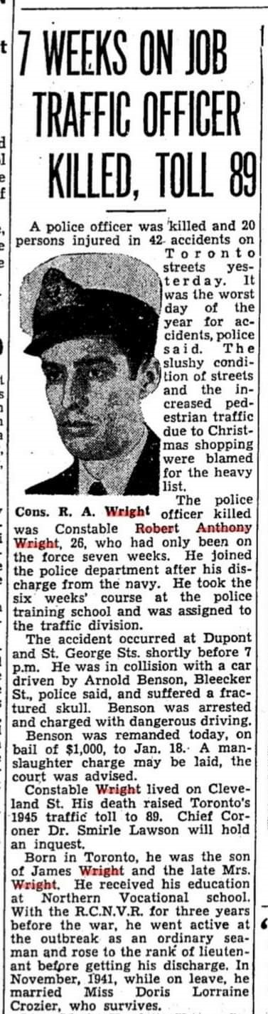7 Weeks On Job Traffic Officer Killed, Toll 89 A police officer was killed and 20 persons injured in 42 accidents on Toronto streets yesterday It was the worst day of the year for the accidents, police said. The slushy conditions of streets and the increased pedestrian traffic due to Christmas shipping were blamed for the heavy list. The police officer killed was Constable Robert Anthony Wright, 26, who had only been on the force for seven weeks. He joined the police department after his discharge from the navy. He took the six weeks' course that police training school and was assigned to the traffic division. the accident occurred at Dupont and St. George Sts. shortly before 7 p.m.. He was in collision with a car driven by Arnold Benson, Bleecker St., police said, and suffered a fractured skill. Denson was arrested and charged with dangerous driving. Benson was remanded todya, on bail of $1,000, to Jan. 18. A manslaughter charge may be laid, the court was advised. Constable Wright lived on Cleveland St. His death raised Toronto's 1945 traffic toll to 89. Chief Coroner Dr. Smirle Lawson will hold an inquest. Born in Toronto, he was the son of James Wright and the late Mrs. Wright. he received his education at Northern Vocational school With the RCNVR for three years before the war, he went active at the outbreak as an ordinary seaman and rose to the rank of lieutenant before getting his discharge. In November, 1941, while on leave, he married Miss Doris Lorraine Crozier, who survives.