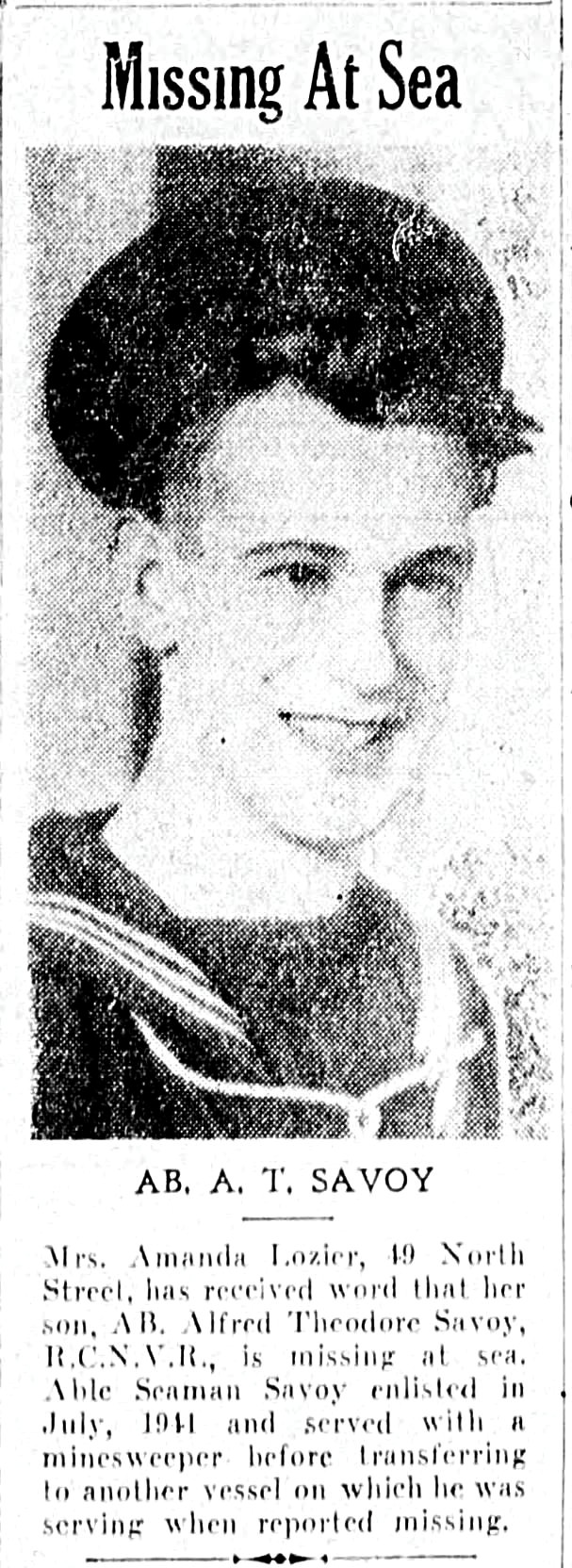 (ATS001) Able Seaman Alfred Savoy Missing at Sea // Courtesy of Operation Picture Me (ATS002) SLT Haddow Baird and AB Alfred Savoy reported missing with the loss of HMCS SHAWINIGAN - Fredericton Daily Gleaner (ATS003) Service file for Alfred Savoy // Source: The Library and Archives of Canada