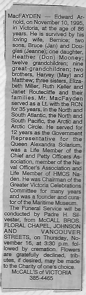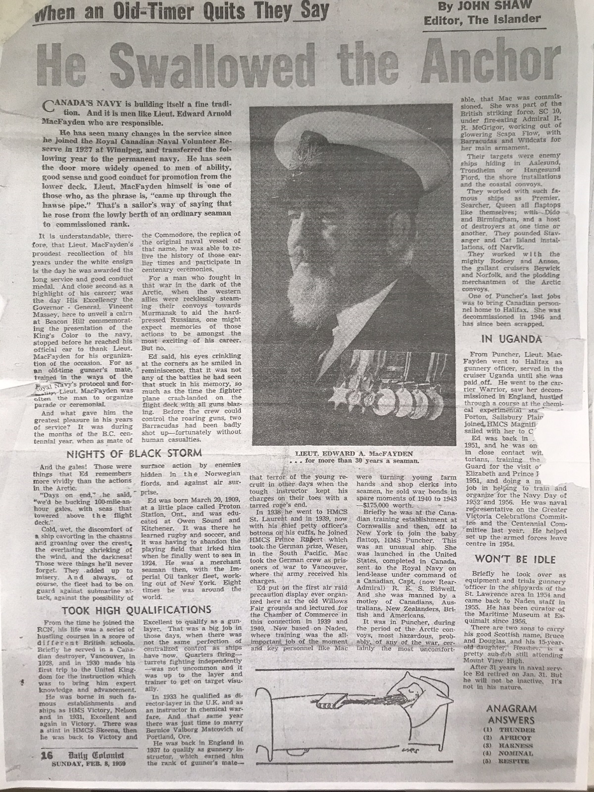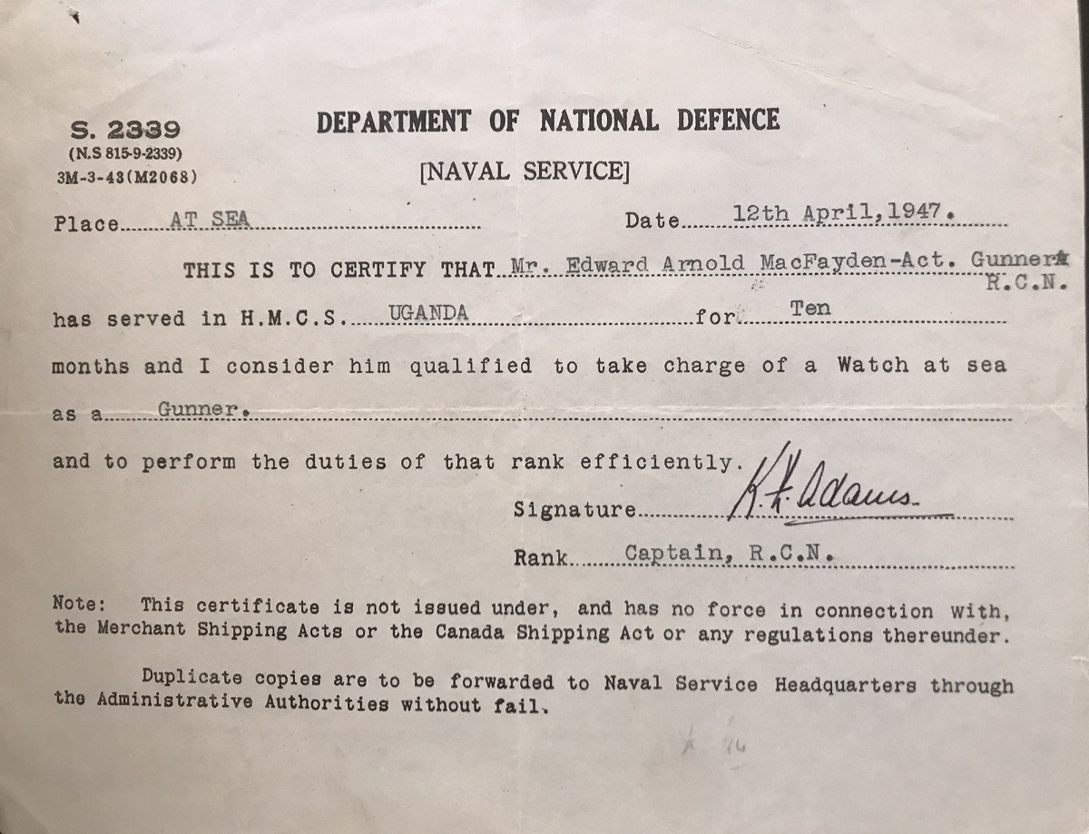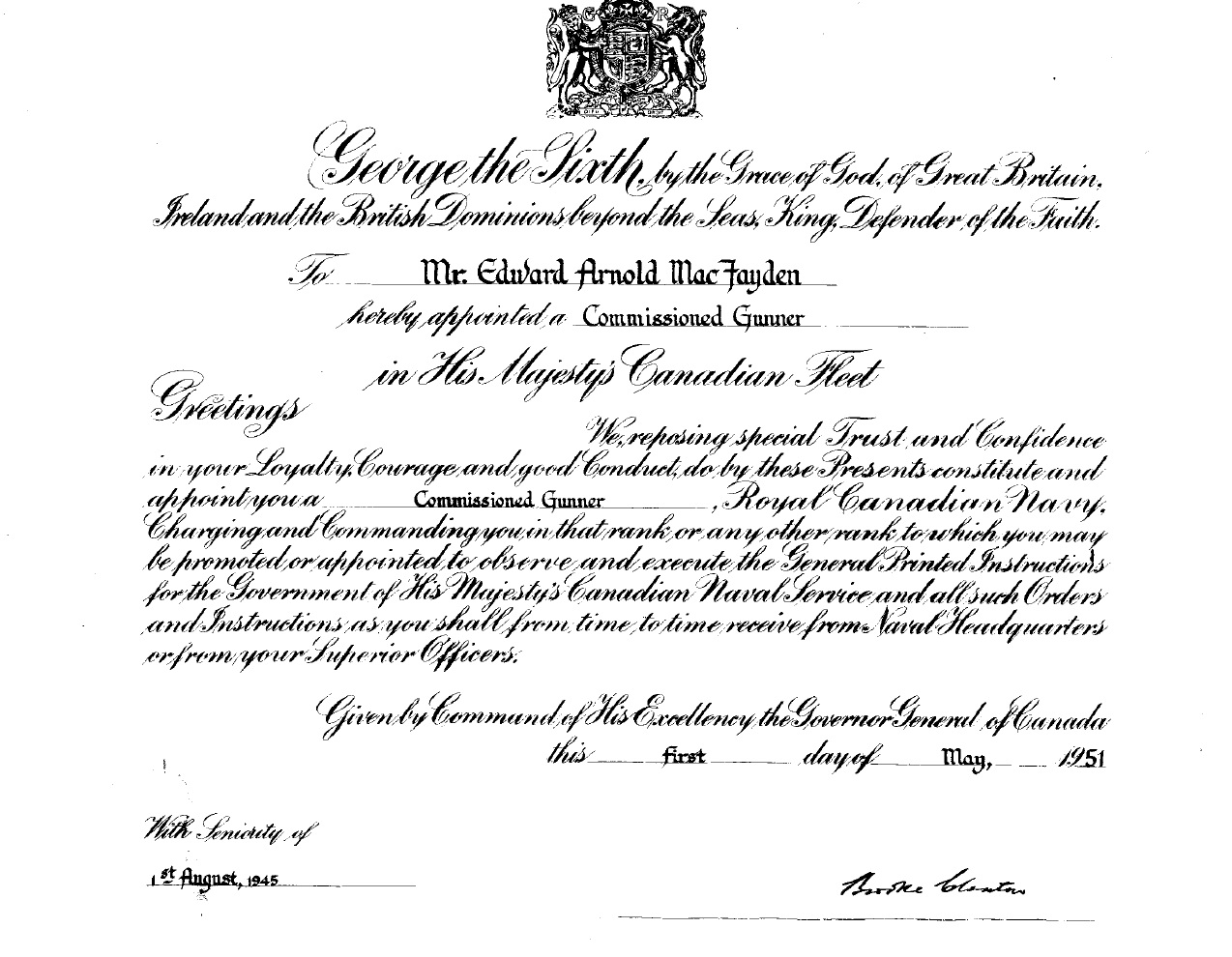 Ships served in: (as an officer) RCN BARRACKS HALIFAX - Appointed to RCN Barracks Halifax as an Act. Gunner (star) (A/Gnr (star)), RCN (seniority 01 Aug 1945) (Navy List Apr 1946) HMCS UGANDA - Appointed to Uganda 05 Jun 1946 as an A/Gnr (star), RCN (Navy List Jul 1946) HMCS WARRIOR - Appointed to Warrior 10 Dec 1947 as a Gnr (star), RCN (Navy List Jan 1948) RCN BARRACKS HALIFAX - Appointed to RCN Barracks Halifax, Gunnery School 08 Jul 1948 as a Gnr (star), RCN (Navy List Jul 1948) HMCS DISCOVERY - Appointed to Discovery 02 Aug 1948 as a Gnr (star), RCN (Navy List Jan 1949). Appointed Cd Gnr (seniority 01 Aug 1945) Navy List Jan 1950) RCN BARRACKS ESQUIMALT - Appointed to RCN Barracks Esquimalt, Gunnery Training Centre 01 Apr 1950 as a Cd Gnr, RCN (Navy List Jul 1950). Appointed Lt (star) (A/Q), RCN (Navy List Oct 1953) HMCS DONNACONA - Appointed to Donnacona 25 May 1954 for Equipment Trials Officer (G) Duties St Lawrence River Area as a Lt (star) (A/Q), RCN (Navy List Jul 1954) RCN BARRACKS ESQUIMALT - Appointed to RCN Barracks Esquimalt, Gunnery Training Centre 16 Oct 1954 as a Lt (star), RCN (Navy List Jan 1955) RCN BARRACKS ESQUIMALT - Appointed to RCN Barracks Esquimalt 30 Sep 1959 as a Lt (star), RCN (Navy List Jan 1960)