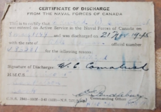 HMCS UNICORN - Drafted to Unicorn 20 Sep 1945. Demobilized 21 Nov 1945