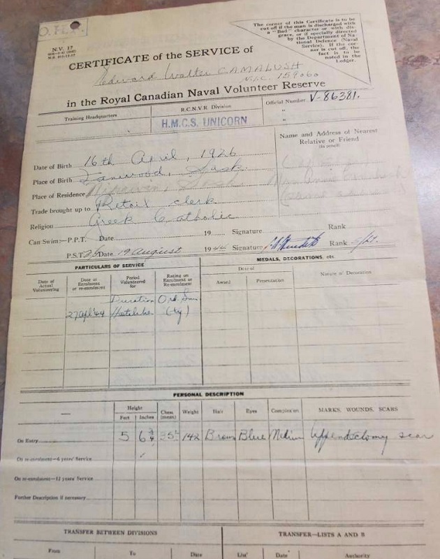 HMCS UNICORN - Enlisted 27 Apr 1944.  Commenced active service 08 May 1944