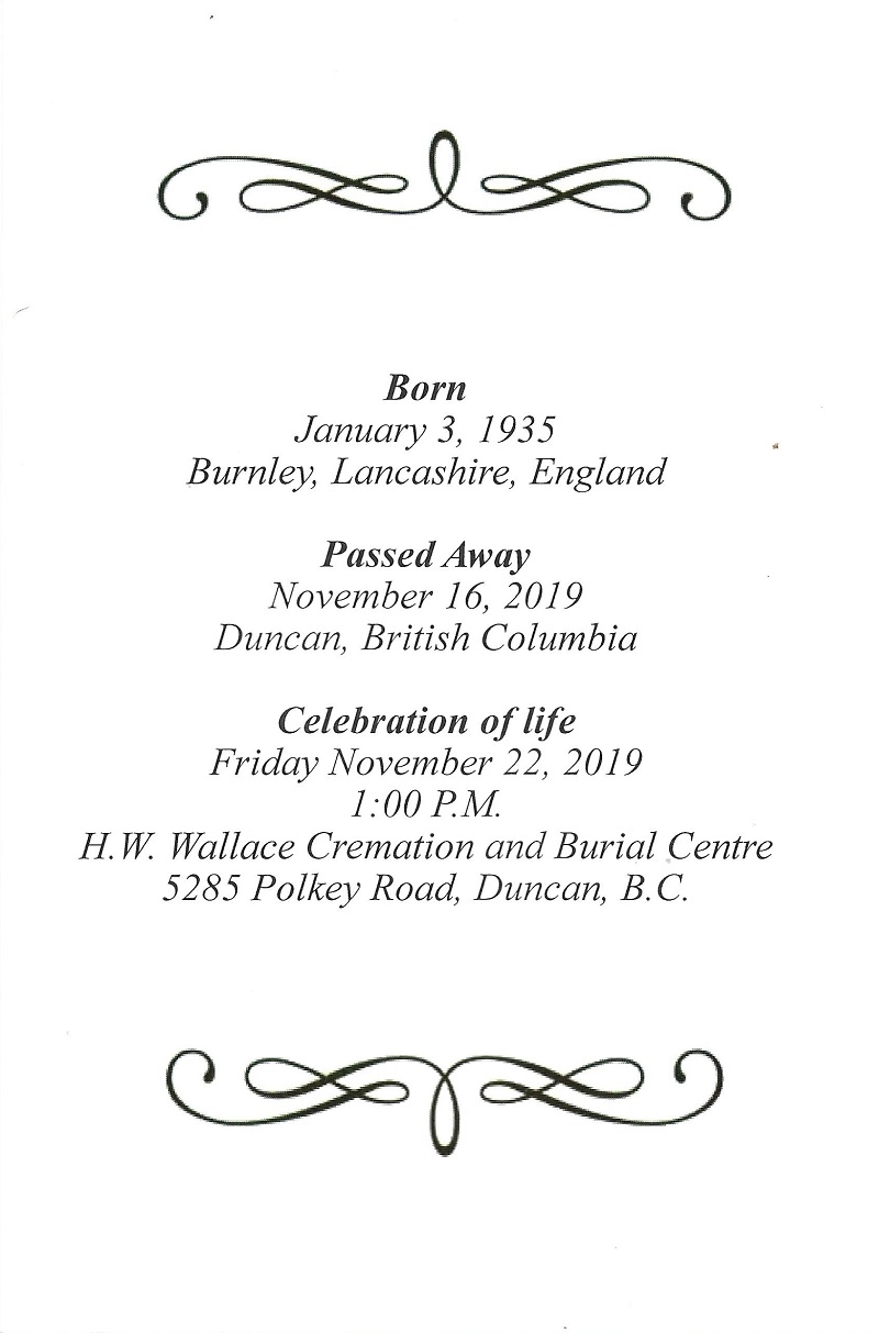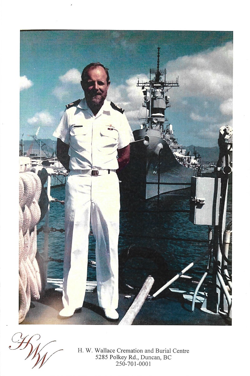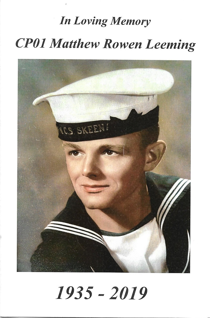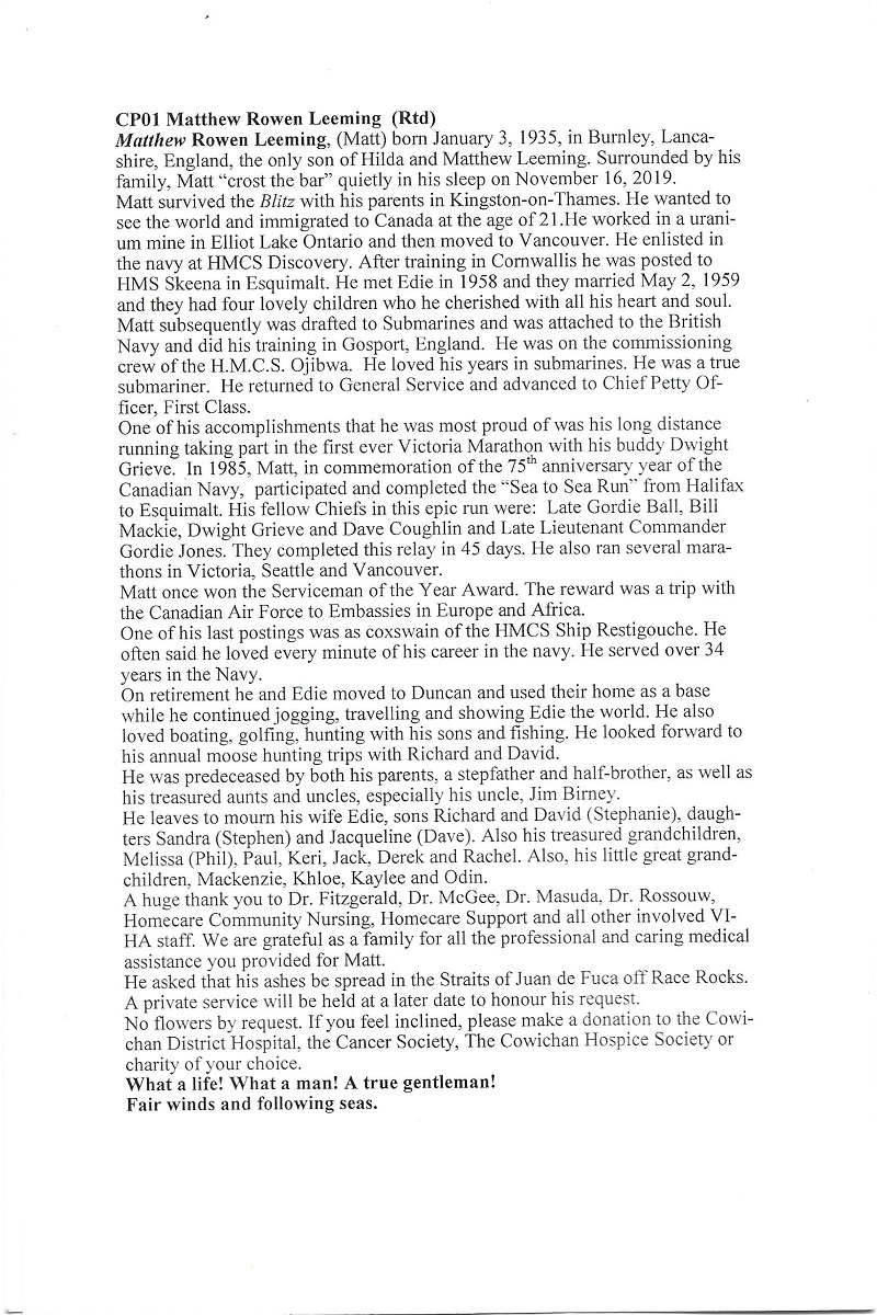 LEEMING, Matthew Rowen (Matt) - passed the bar quietly in his sleep in the morning of November 16, 2019 in Duncan, BC. He was the only son of Matthew and Hilda Leeming, born in Burnley, Lancashire, England January 3, 1935. Matt came to Canada in 1956, first to Elliot Lake and then Vancouver. He enlisted in the Canadian Navy at HMCS DISCOVERY. He served in both General and Submarine services. He loved being a submariner. One of his last postings was as CPO1, Coxswain of the RESTIGOUCHE. He said he loved every minute of being in the Navy. He served over 34 years. He often said coming to Canada was the best move he ever made. He embraced life to the fullest. He was a marathon runner. He golfed, hunted, fished, and boated. He loved being on the water and outdoors. He also introduced Edie to the West End Theatres in London. Yes, he did love Phantom of the Opera and Les Miserable. Matt married Edith (Edie) Williams in 1959 and had four children who were his pride and joy. As a family they moved all over the world. He provided them with an exciting life. He taught them to be observant and respectful of all races, religions and cultures. He was predeceased by his parents, stepfather, stepbrother and all of his beloved aunts and uncles. Matt leaves to mourn his wife, Edie, sons Richard and David, daughters Sandra (Stephen)and Jacqueline (Dave). Also, his treasured grandchildren, Melissa (Phil), Paul, Keri, Jack, Derek and Rachel, and his great- grandchildren, Mackenzie, Khloe, Kaylee and Odin. A huge thank you to all the doctors in the cancer clinic and VIHA staff who assisted in his final days at home. Also, Veteran Affairs for their support. A Celebration of Life on November 22, 2019 at 1:00pm at H.W. Wallace Cremation and Burial Centre. No flowers please. A donation to Cowichan District Hospital, the Cancer Clinic or charity of your choice. (Victoria Times Colonist 20 Nov 2019)