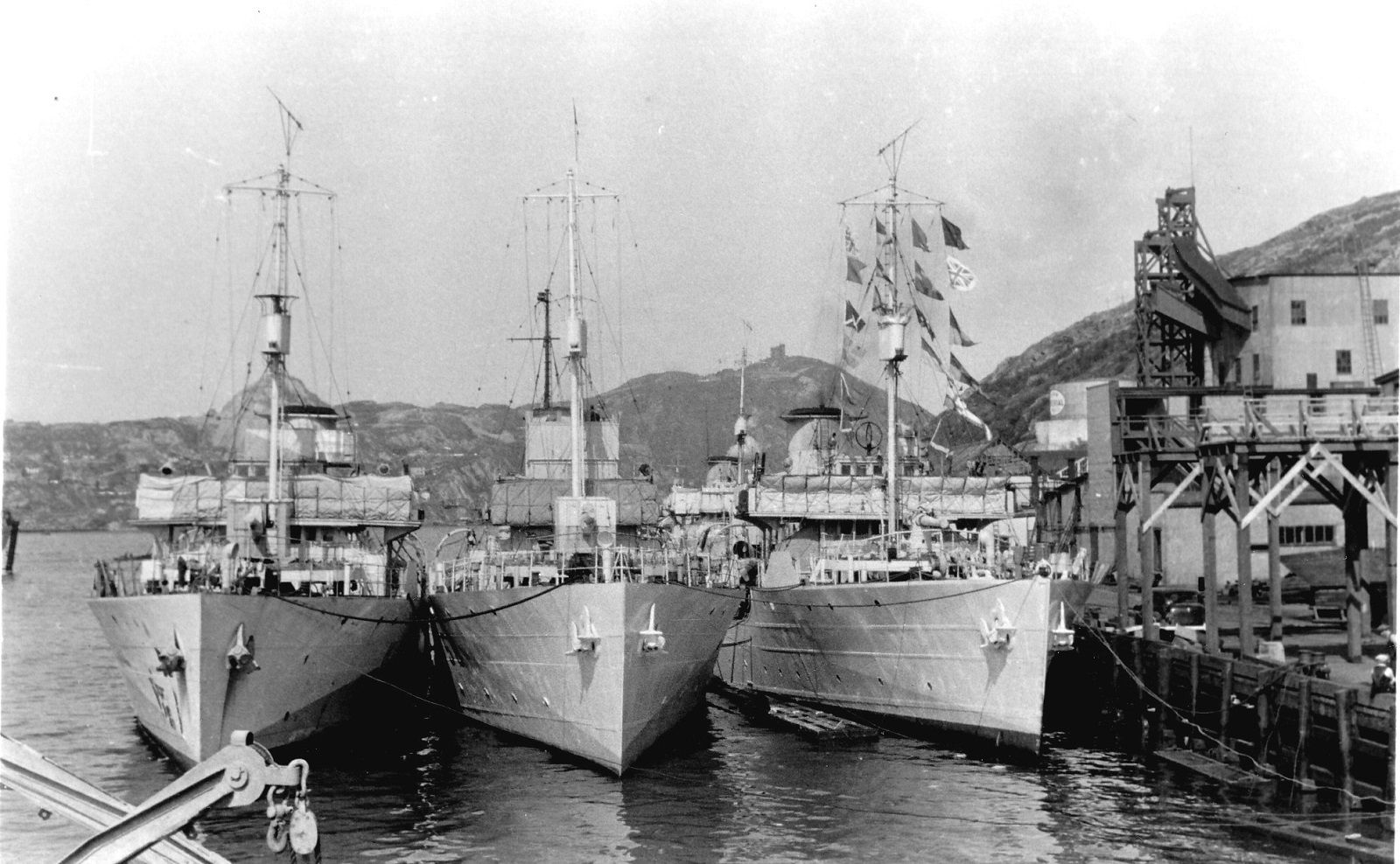 (4) HMS Rodney off Hvalfjorður Fjord - Dec 1941 (5) HMCS Agassiz riding high astern of HMCS Orillia (6) Three corvette alongside at St. John's, Nfld