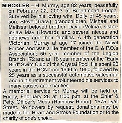 MINCKLER, Harold Murray - was born in Victoria, BC on 01 Mar 1921. He joined the RCN on 16 Sep 1940 and served in the Navy during World War Two in the Atlantic, the Mediterranean, and the Gulf of St. Lawrence. He also served during the Korean War in HMCS Sioux. While serving in HMS RAMILLIES, Murray witness the meeting between Winston Churchill and President Roosevelt, which resulted in the United States giving aid to the allies. He experienced intense attacks by enemy aircraft while serving in the British destroyer HMS ICARUS and the sinking of a submarine when serving in HMCS VILLE DE QUEBEC on convoy duty near Algiers, North Africa. He remembers his ship "went right through the submarine which split in two and went down". He was a member of the Esquimalt Dockyard Legion Branch 172 for 50 years. Murray passed away on 22 Feb 2003.