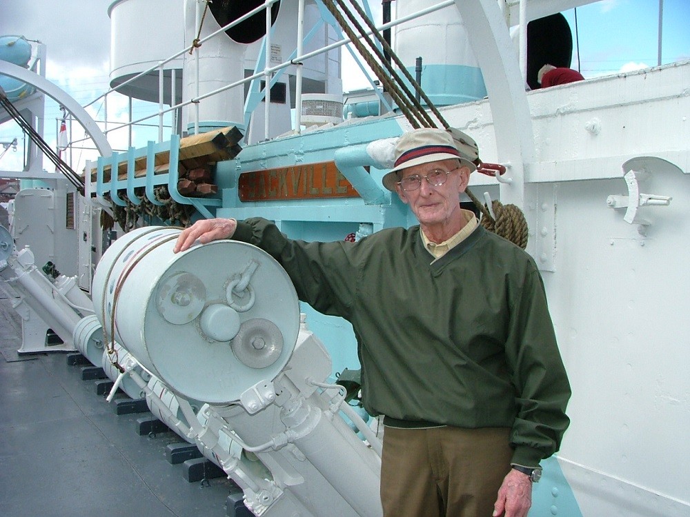 (PJD005) Percy D'Aoust on HMCS SACKVILLE (The Last Corvette), Halifax, NS. The depth charge thrower Percy is standing beside was his action / battle station when he was on the corvette HMCS VILLE DE QUEBEC. (PJD6) Portrait of Percy D'Aoust