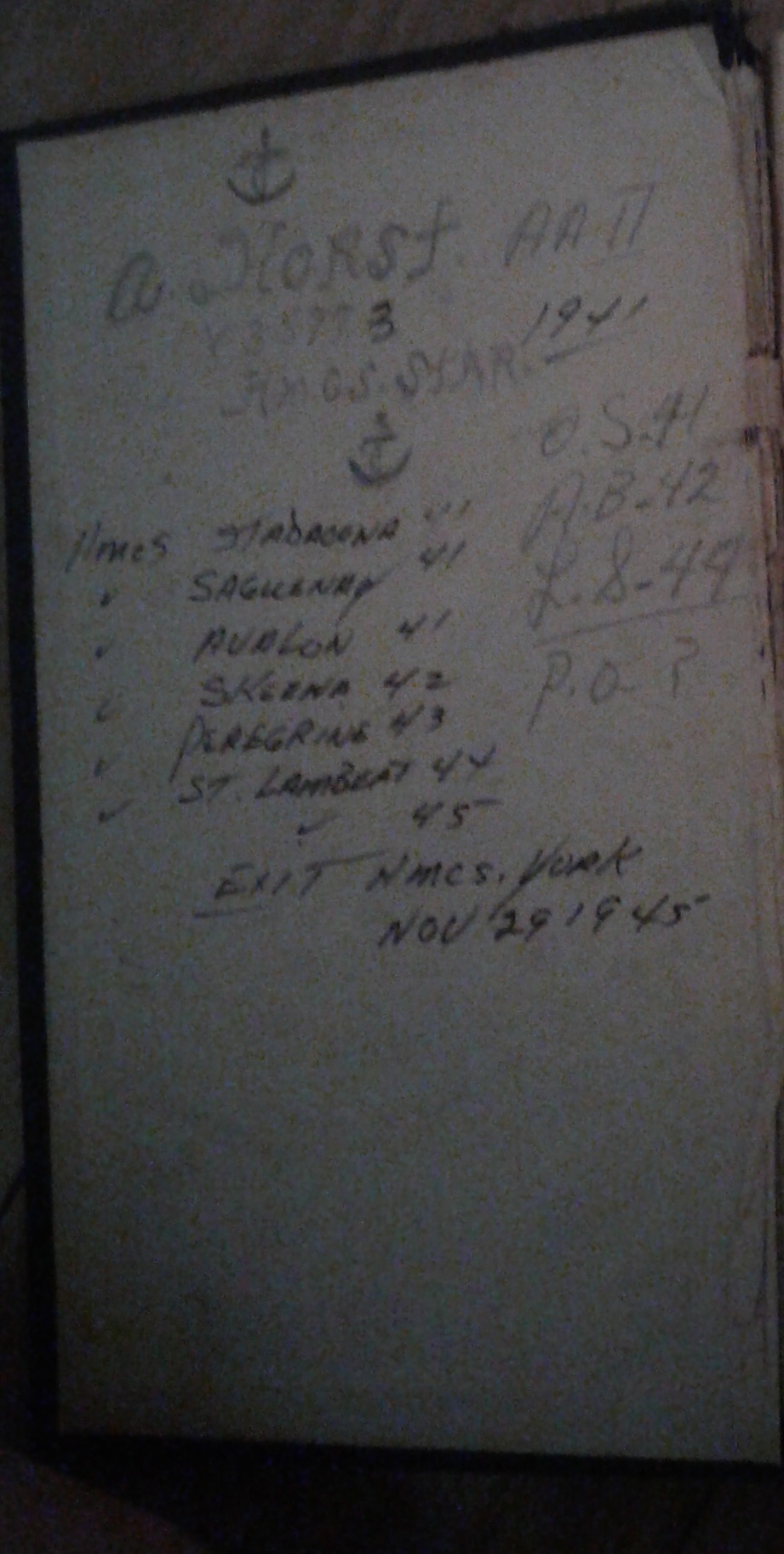 Ships served in: HMCS STAR - Enlisted in 1941 HMCS SAGUENAY - Served in SAGUENAY in 1941 HMCS SKEENA - Served in SKEENA in 1942 HMCS ST LAMBERT - Served in ST LAMBERT in 1944-1945 HMCS YORK - Demobilized 29 Nov 1945