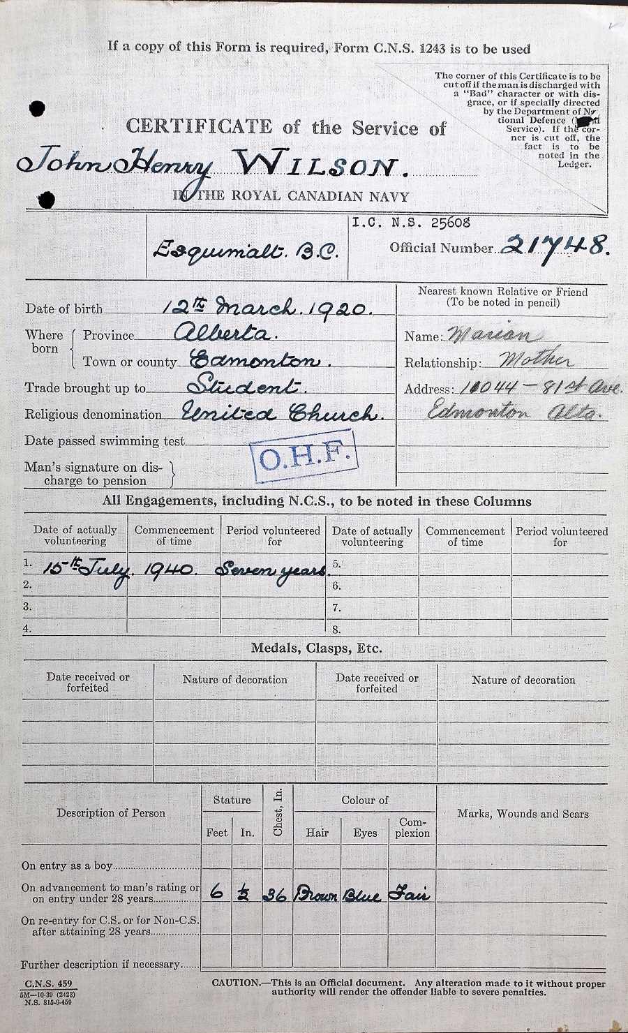 John's aircraft, on a training run, crashed in the Mediterranean Sea. His name is on the El Alamein Memorial in North Africa. Ships served in: HMCS KAMLOOPS - Served in Kamloops 12 Apr 1941 - 07 May 1941 as a Stoker 2c, RCN