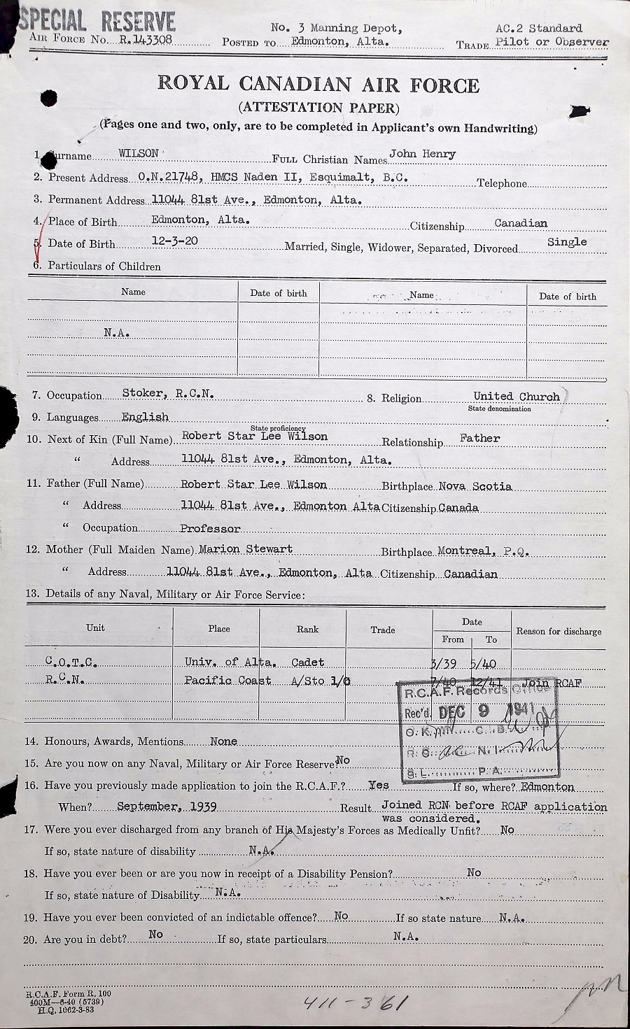 WILSON, John H., FO - son of Prof. and Mrs. R.S.L. Wilson, 11044 81 ave., who has been presumed dead, according to word received by his father, dean of applied science at the University of Alberta. He was reported missing last August. The airman enlisted in the navy in 1940 and transferred to the air force in 1941. He went overseas in 1943, and served in East Africa and Arabia. He was lost off Palestine. Born in Edmonton, he attended Garneau and Strathcona high schools and was at the university when he enlisted.