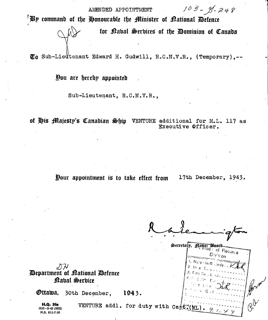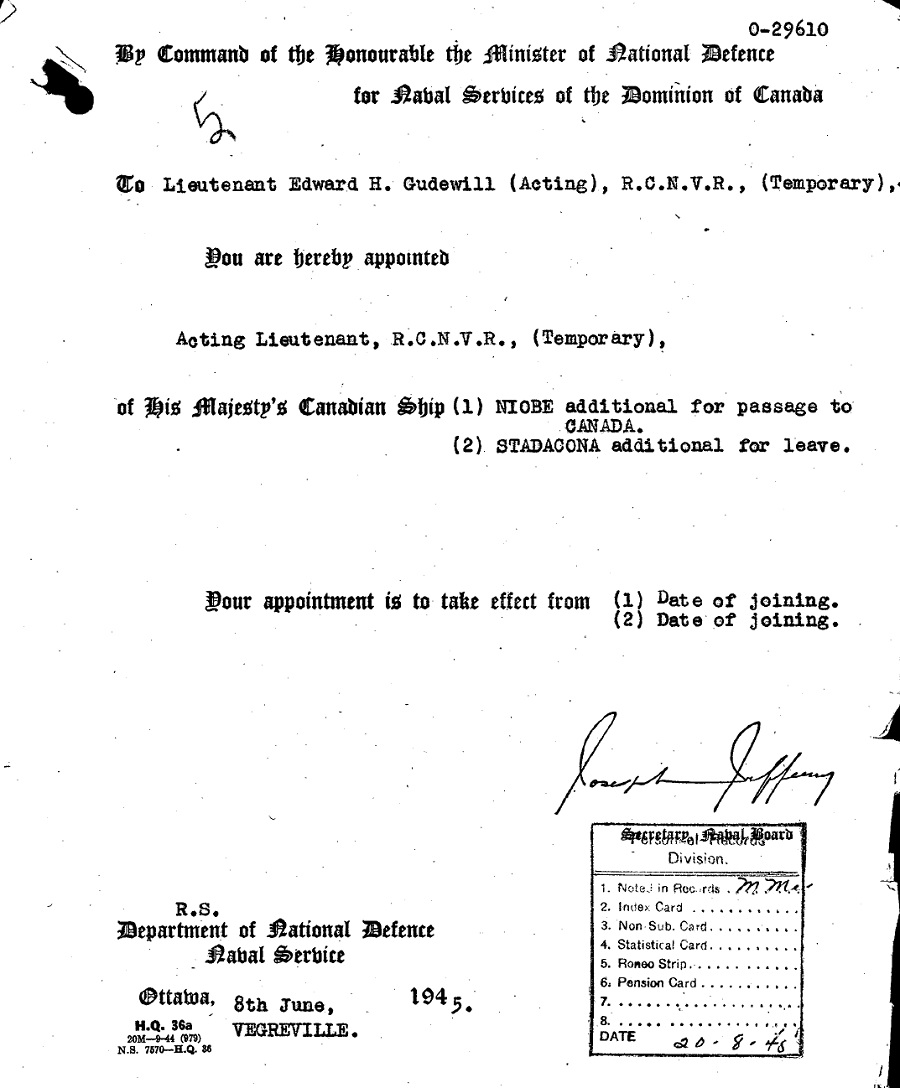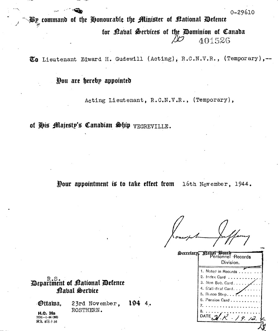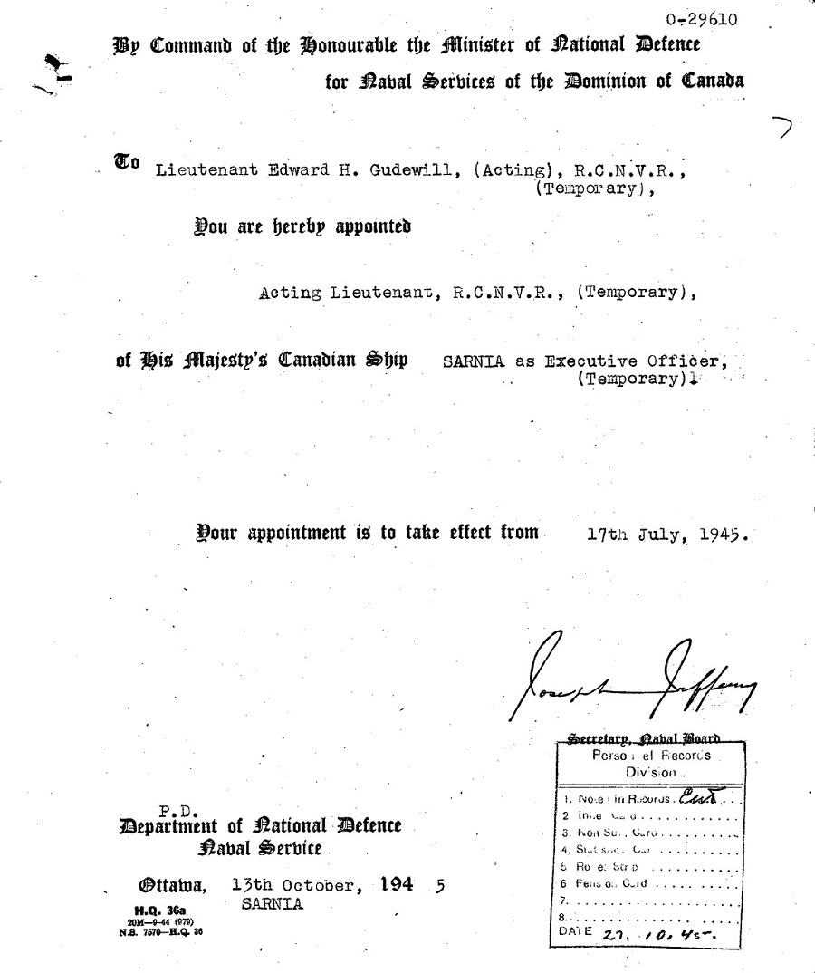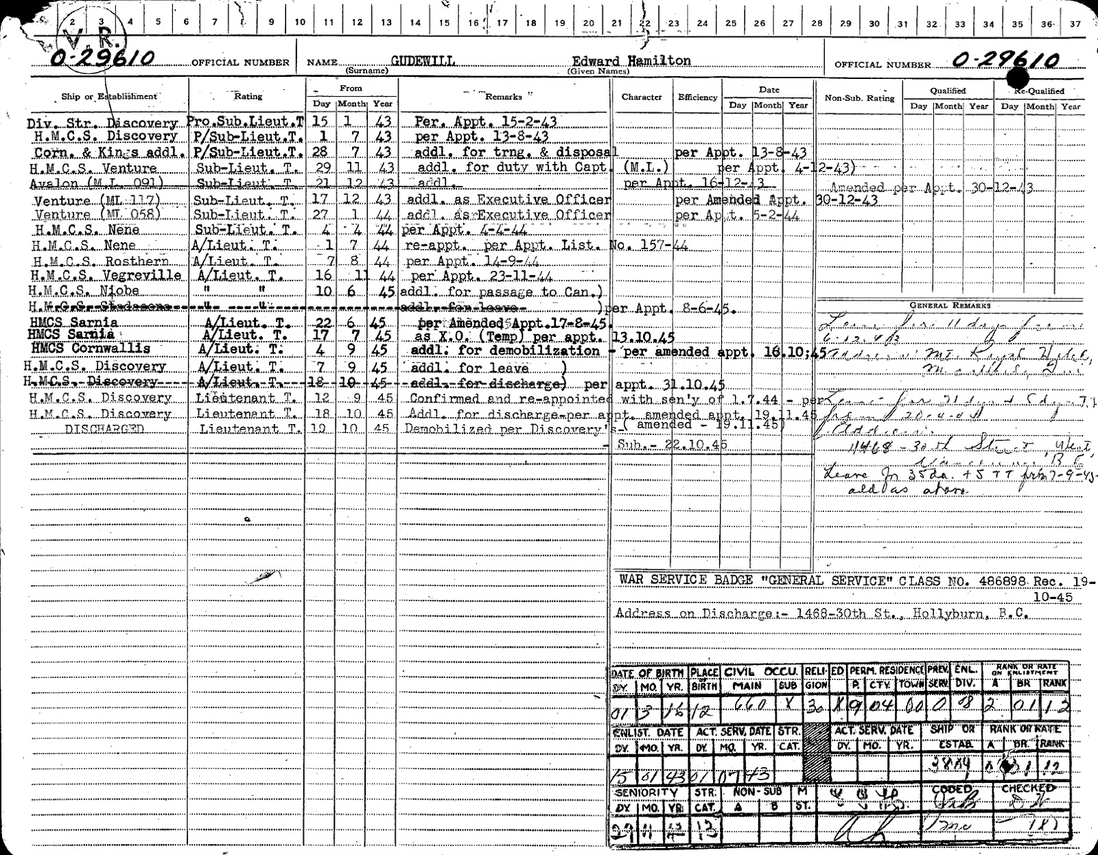 Ships served in: HMCS DISCOVERY (Divisional Strength) 15 Jan 1943 as a Prob SLt, RCNVR (Service file for Edward Gudewill) HMCS DISCOVERY - Appointed to Discovery 01 Jul 1943 as a Prob SLt, RCNVR (Service file for Edward Gudewill) HMCS CORNWALLIS & HMCS KINGS - Appointed to Cornwallis and Kings 28 Jul 1943 as a Probationary SLt, RCNVR add'l for Training and Disposal (Service file for Edward Gudewill) HMCS VENTURE - Appointed to Venture 29 Nov 1943 as a SLt, RCNVR, add'l for duty with Capt. (M.L.) (Service file for Edward Gudewill) ML Q117 - Appointed to ML Q117 17 Dec 1943 as a SLt, RCNVR, XO (Service file for Edward Gudewill). Served as CO 17 Dec 1943 - 25 Jan 1944 (Macpherson-Burgess - Ships of Canada's Naval Forces 1910-1981) ML Q058 - Appointed to ML Q058 27 Jan 1944 as a SLt, RCNVR, XO (Service file for Edward Gudewill) HMCS NENE - Appointed to Nene 04 Apr 1944 as a SLt, RCNVR (Navy List May 1944). Appointed A/Lt, RCNVR 01 Jul 1944 (Service file for Edward Gudewill) HMCS ROSTHERN - Appointed to Rosthern 07 Aug 1944 as an A/Lt, RCNVR (Navy List Sep 1944) HMCS VEGREVILLE - Appointed to Vegreville 16 Nov 1944 as an A/Lt, RCNVR (Navy List Jan 1945) HMCS NIOBE - Appointed to Niobe (add'l for passage to Canada) 10 Jun 1945 as an A/Lt, RCNVR (Service file for Edward Gudewill) HMCS STADACONA - Appointed to Stadacona as an A/Lt, RCNVR (add'l for leave) (Service file of Lt Gudewill) * Appointed Lt, RCNVR 12 Sep 1945 (seniority 01 Jul 1944) (Service file of Lt Gudewill) HMCS SARNIA - Appointed to Sarnia 22 Jun 1945 as an Lt, RCNVR. Appointed XO 17 Jul 1945 (Service file for Edward Gudewill) HMCS CORNWALLIS - Appointed to Cornwallis 04 Sep 1945 as an Lt, RCNVR add'l for demobilization (Service file for Edward Gudewill) HMCS DISCOVERY - Appointed to Discover 07 Sep 1945 as an Lt, RCNVR. Appointed Lt, RCNVR (seniority 01 Jul 1944) (Service file for Edward Gudewill). HMCS DISCOVERY - Demobilized 19 Oct 1945 (Service file for Edward Gudewill)