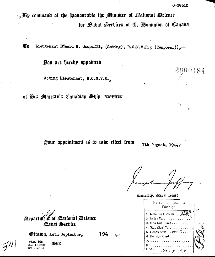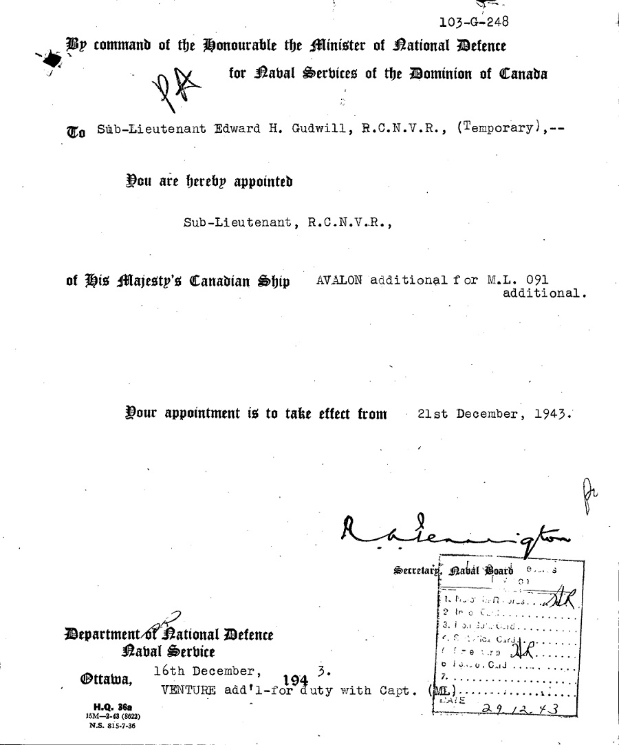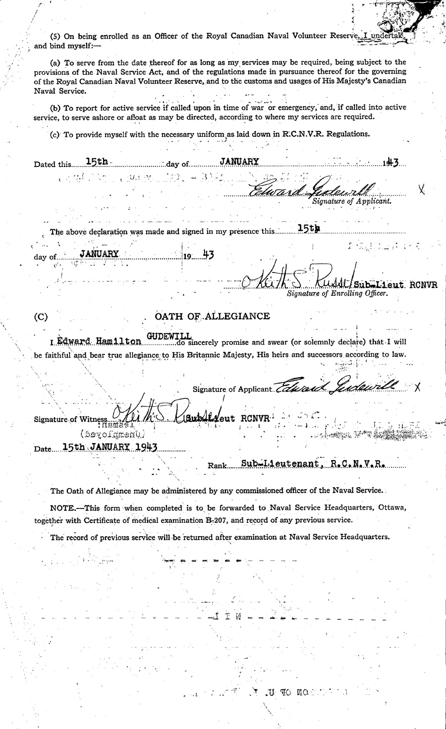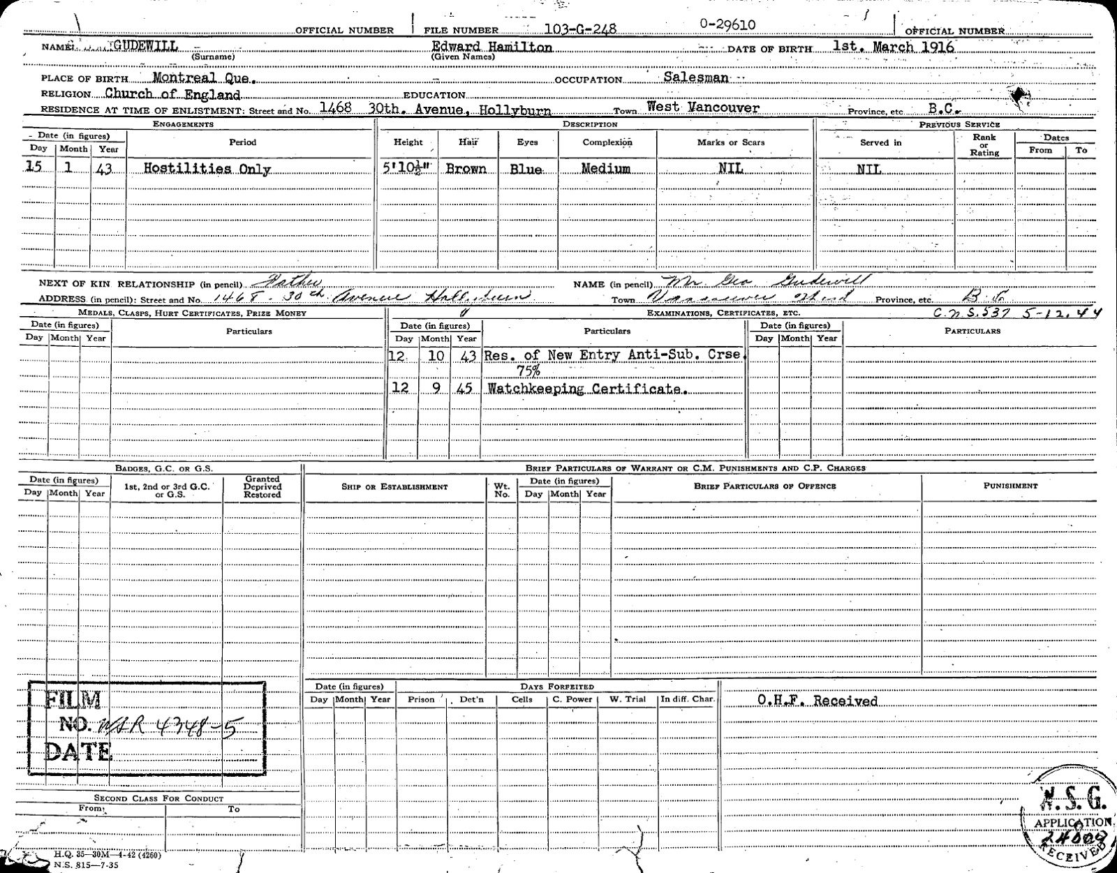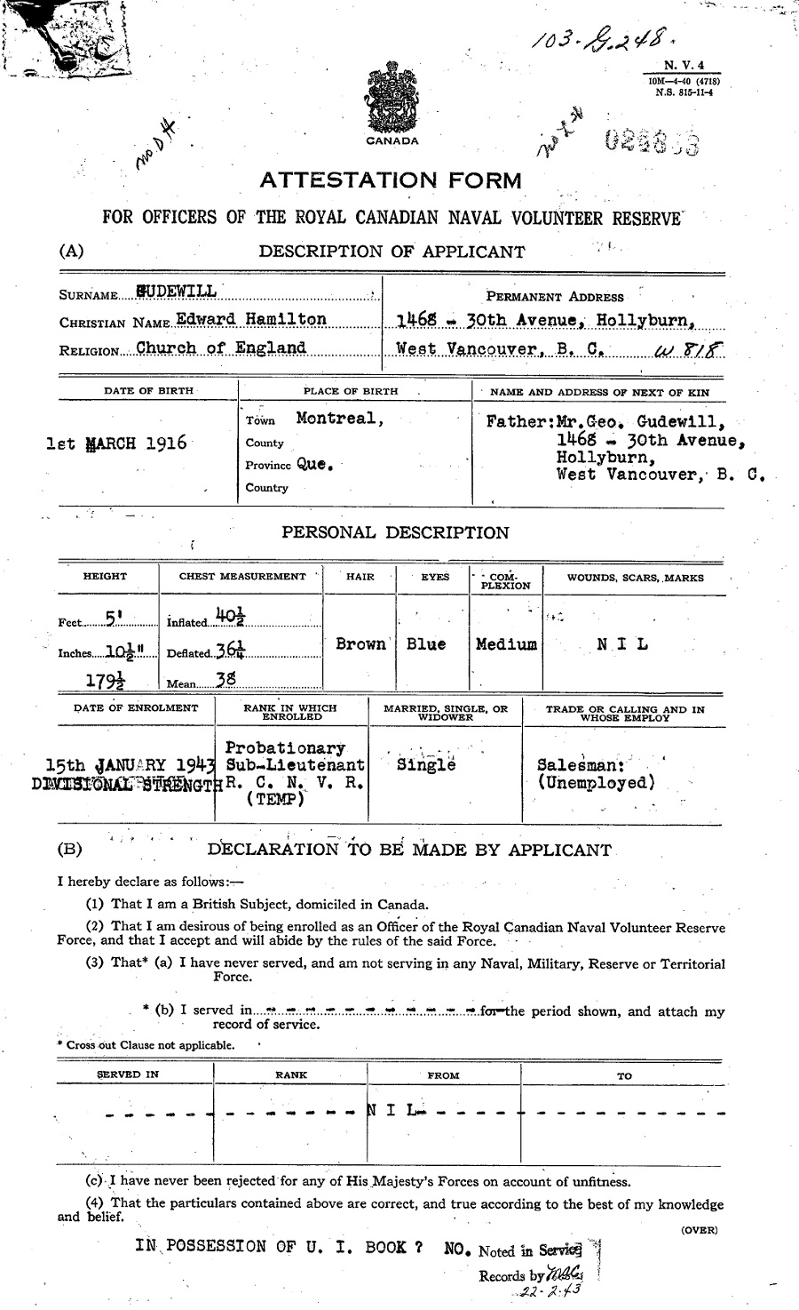 Ships served in: HMCS DISCOVERY (Divisional Strength) 15 Jan 1943 as a Prob SLt, RCNVR (Service file for Edward Gudewill) HMCS DISCOVERY - Appointed to Discovery 01 Jul 1943 as a Prob SLt, RCNVR (Service file for Edward Gudewill) HMCS CORNWALLIS & HMCS KINGS - Appointed to Cornwallis and Kings 28 Jul 1943 as a Probationary SLt, RCNVR add'l for Training and Disposal (Service file for Edward Gudewill) HMCS VENTURE - Appointed to Venture 29 Nov 1943 as a SLt, RCNVR, add'l for duty with Capt. (M.L.) (Service file for Edward Gudewill) ML Q117 - Appointed to ML Q117 17 Dec 1943 as a SLt, RCNVR, XO (Service file for Edward Gudewill). Served as CO 17 Dec 1943 - 25 Jan 1944 (Macpherson-Burgess - Ships of Canada's Naval Forces 1910-1981) ML Q058 - Appointed to ML Q058 27 Jan 1944 as a SLt, RCNVR, XO (Service file for Edward Gudewill) HMCS NENE - Appointed to Nene 04 Apr 1944 as a SLt, RCNVR (Navy List May 1944). Appointed A/Lt, RCNVR 01 Jul 1944 (Service file for Edward Gudewill) HMCS ROSTHERN - Appointed to Rosthern 07 Aug 1944 as an A/Lt, RCNVR (Navy List Sep 1944) HMCS VEGREVILLE - Appointed to Vegreville 16 Nov 1944 as an A/Lt, RCNVR (Navy List Jan 1945) HMCS NIOBE - Appointed to Niobe (add'l for passage to Canada) 10 Jun 1945 as an A/Lt, RCNVR (Service file for Edward Gudewill) HMCS STADACONA - Appointed to Stadacona as an A/Lt, RCNVR (add'l for leave) (Service file of Lt Gudewill) * Appointed Lt, RCNVR 12 Sep 1945 (seniority 01 Jul 1944) (Service file of Lt Gudewill) HMCS SARNIA - Appointed to Sarnia 22 Jun 1945 as an Lt, RCNVR. Appointed XO 17 Jul 1945 (Service file for Edward Gudewill) HMCS CORNWALLIS - Appointed to Cornwallis 04 Sep 1945 as an Lt, RCNVR add'l for demobilization (Service file for Edward Gudewill) HMCS DISCOVERY - Appointed to Discover 07 Sep 1945 as an Lt, RCNVR. Appointed Lt, RCNVR (seniority 01 Jul 1944) (Service file for Edward Gudewill). HMCS DISCOVERY - Demobilized 19 Oct 1945 (Service file for Edward Gudewill)