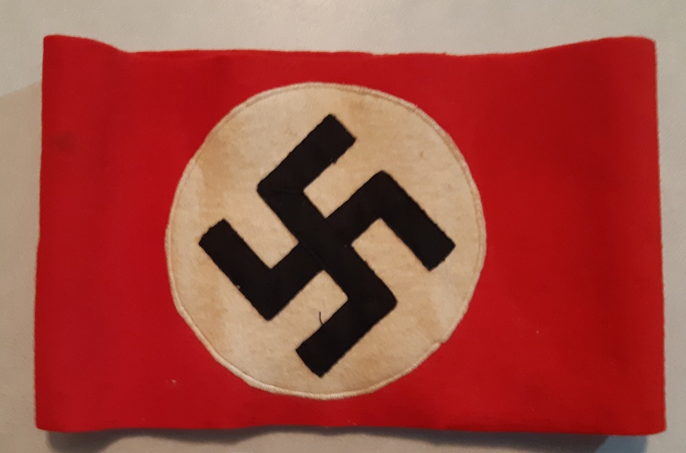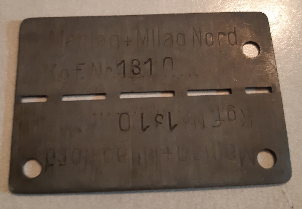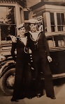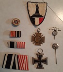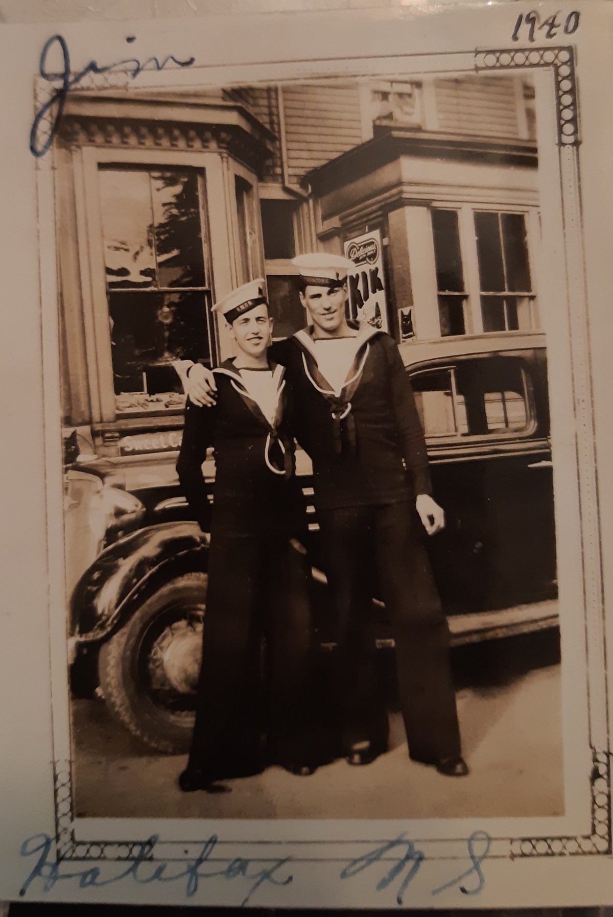 (1) Jim L'Esperance (left), Halifax, 1940  (3) Jim's POW dog-tags   (4) Poem - HMCS ATHABASKAN by Stuart Kettles, L/Writer, RCNVR (pdf file) (5) Jim traded the cigarettes that came in his Red Cross packages for medals, pins and patches from the guards at the POW camp.  Jim said most of the guards were WW1 veterans. The two medals are from WW1.  (6) SS arm band that Jim picked up