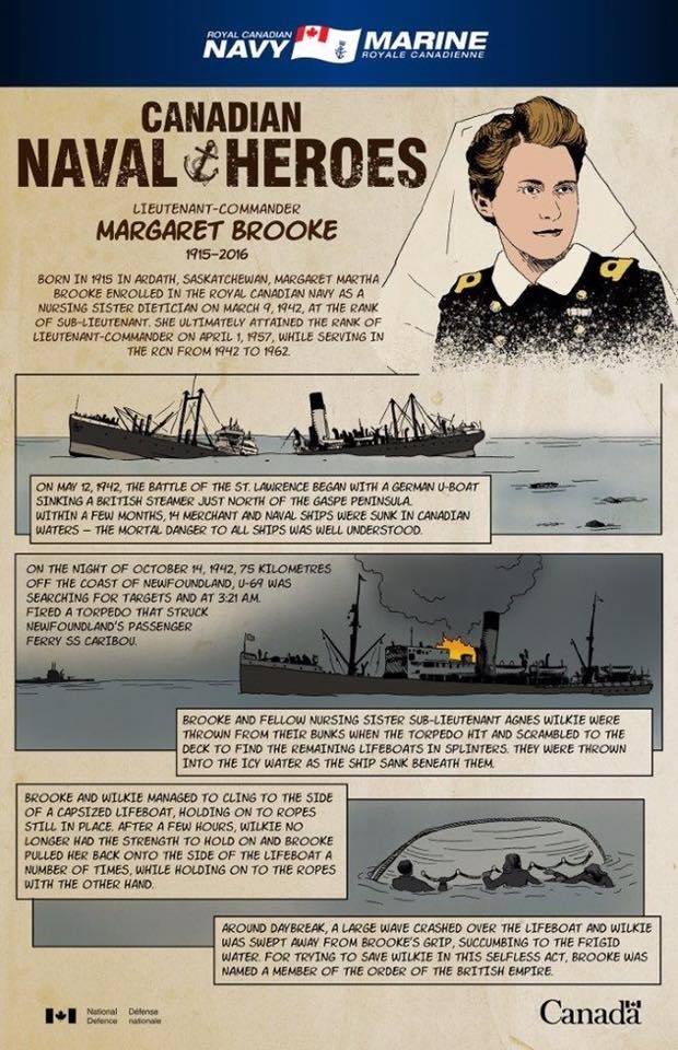 BROOKE, Margaret Martha - Predeceased by her brother Hewitt Brooke (1973) and sister-in-law Marian Brooke (2010). Fondly remembered by nieces, nephews, great-nieces, great-nephews, and one great-great-nephew of Vancouver, BC and Edmonton, AB. Aunt Margaret grew up in the small farming community of Ardath, Saskatchewan during the Depression and the "dust bowl" era which endowed her with uncommon strength and discipline. Luckily, Aunt Margaret was the daughter of Maude Brooke who was determined that her daughter would attend university. At the age of 18, in 1933, she moved to Saskatoon with her brother Hewitt to attend the University of Saskatchewan where she earned her B.H.Sc. after which she moved to Ottawa to complete her Dietetic Internship at the Ottawa Civic Hospital and earn her C.D. In March 1942, Aunt Margaret joined the Royal Canadian Navy in HMCS Unicorn, Saskatoon, SK. She served as a Nursing Sister in RCN hospitals in HMCS Avalon, St. John's, NL; HMCS St. Hyacinth, St. Hyacinth, QC; HMCS Naden, Esquimalt, BC; and HMCS Stadacona, Halifax, NS. While serving at HMCS Avalon in St. John's, NL, Aunt Margaret was returning from leave when her ferry, the "Caribou", was torpedoed in the middle of the night while sailing the Cabot Strait on October 14, 1942. She spent a harrowing night in the water clinging to the keel of an upturned lifeboat while desperately trying to save the life of her friend Agnes Wilkie. For her determined and selfless efforts, she was awarded an MBE (military) in January 1943 for bravery, the highest honour a woman could receive in that time period. Aunt Margaret retired from the RCN in September 1962 and returned to Saskatoon to assist her aging parents. During this time, to broaden her horizons, she returned to the University of Saskatchewan where she earned a B.A. and then a Ph.D. majoring in biostratigraphy and micro- palaeontology. She remained in the Department of Geological Sciences instructing and as a Research Associate until June 1986, when she retired from her fulfilling career as a palaeontologist. While serving in Esquimalt, BC, Aunt Margaret decided she really belonged on the West Coast and vowed to make Victoria her home. So, upon her retirement, she moved west to fulfil her long- cherished desire. Upon her move to Victoria, she eagerly embraced all it had to offer. Her lovely townhome in Rockland with its private garden, the Newcomers Club, courses at U.Vic., volunteering at Craigdarroch Castle and the Lieutenant Governor's House, frequent visits to local antique shops to buy treasures for her new home, long, long walks everywhere, and visits with her nieces, nephews and a multitude of new and old friends kept her life full and invigorating. On her 100th birthday, Aunt Margaret received a phone call from the Minister of National Defence whereupon she was informed that one of six new Arctic Patrol Ships was to be named the HMCS Margaret Brooke in recognition of her heroism during the sinking of the "Caribou". Also, Commodore Robert Auchterlonie from HMCS Naden made a personal visit to congratulate her on this announcement. This was the first time a RCN vessel was named after a woman and only the second time, one had been named after a person. As she had always been proud of her years of service in the RCN, receiving this recognition was especially gratifying. Aunt Margaret was a remarkable woman who lived a remarkable and accomplished life. We will miss her. At her request, there will be no service, but a reception for family and friends will be held in April. The time and place will be announced at a later date. In lieu of flowers, donations to a favourite charity would be appreciated. (The Saskatoon StarPhoneix 22 Jan 2016)
