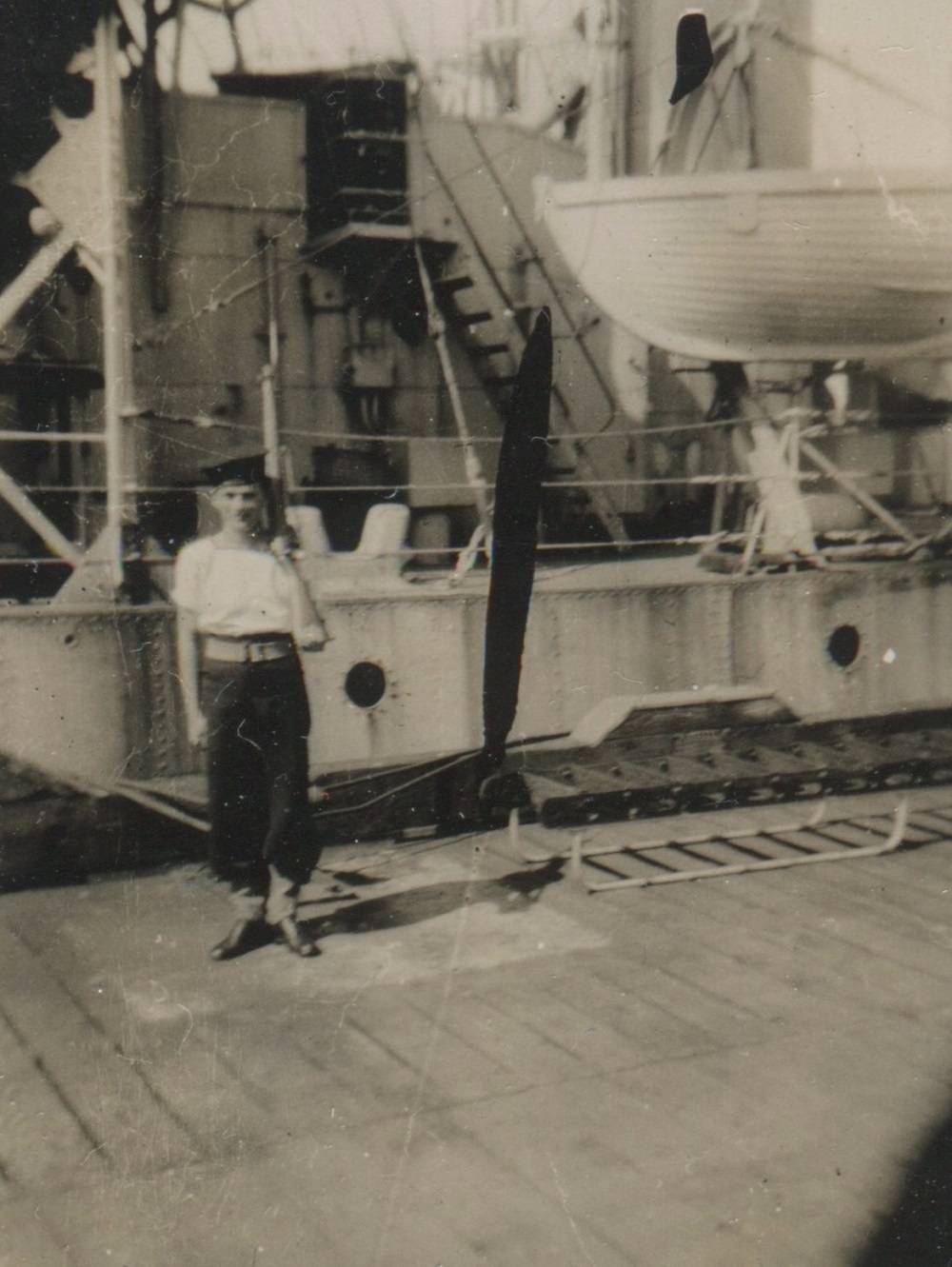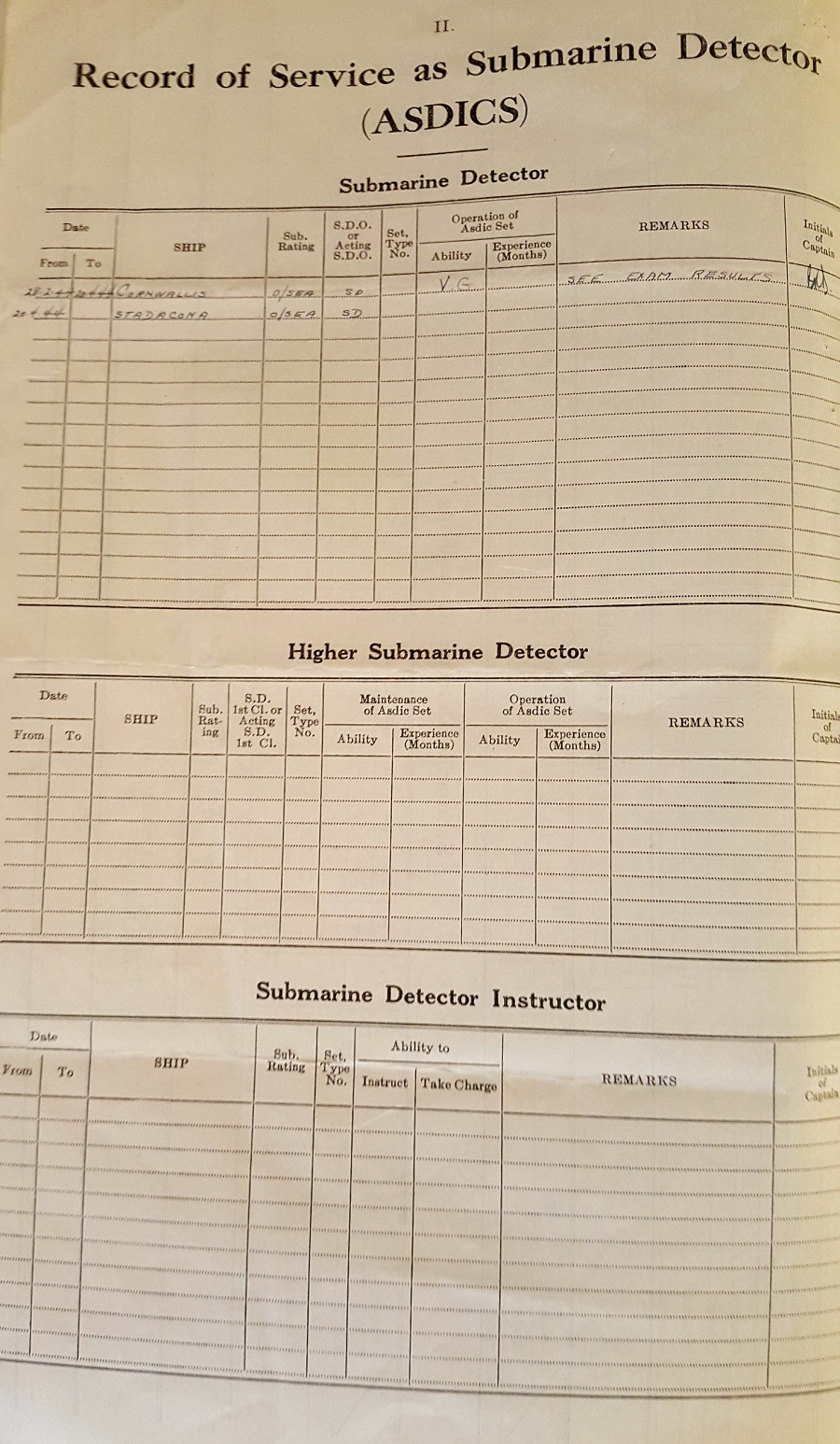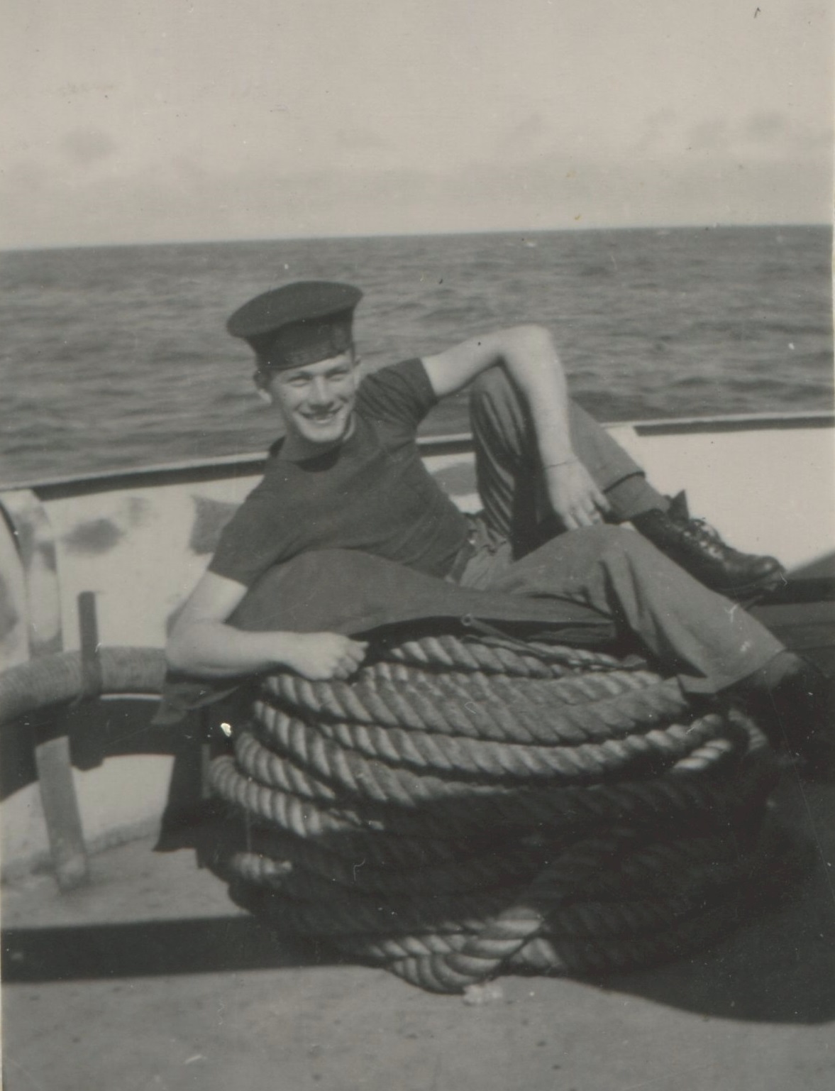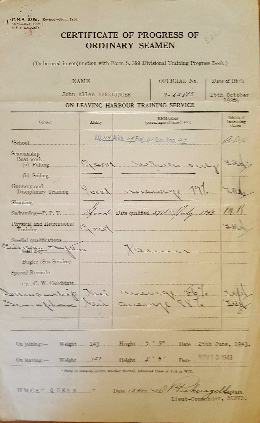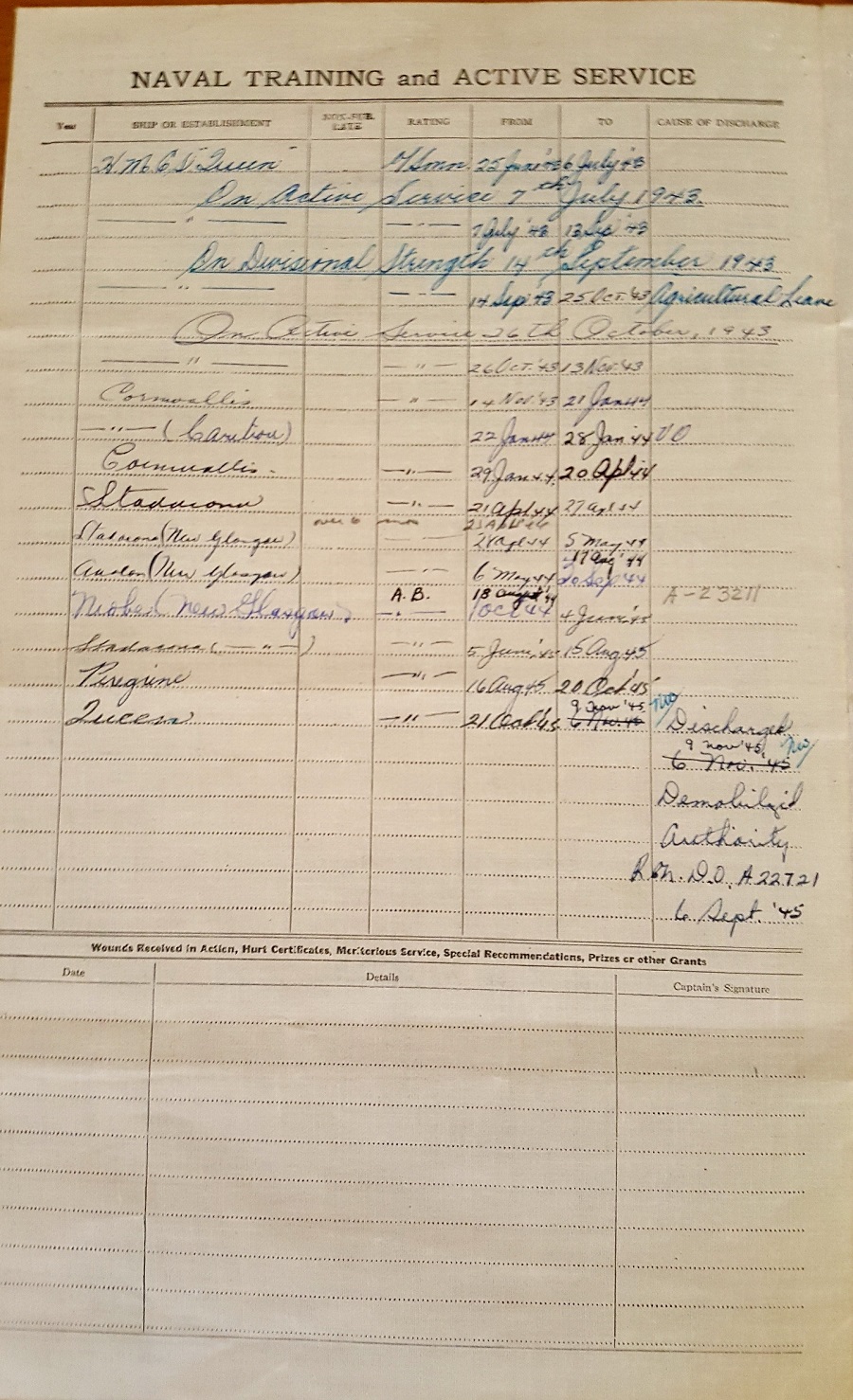 Ships served in: HMCS QUEEN - Enlisted 25 Jun 1943. Commenced active service 07 Jul 1943 HMCS CARIBOU - Served in Caribou 22 Jan 1944 - 28 Jan 1944 while in training at HMCS Cornwallis HMCS NEW GLASGOW - Served in New Glasgow 28 Apr 1944 - 15 Aug 1945 as an OS and AB, RCNVR. Rated AB 18 Aug 1944 HMCS QUEEN - Demobilized 09 Nov 1945