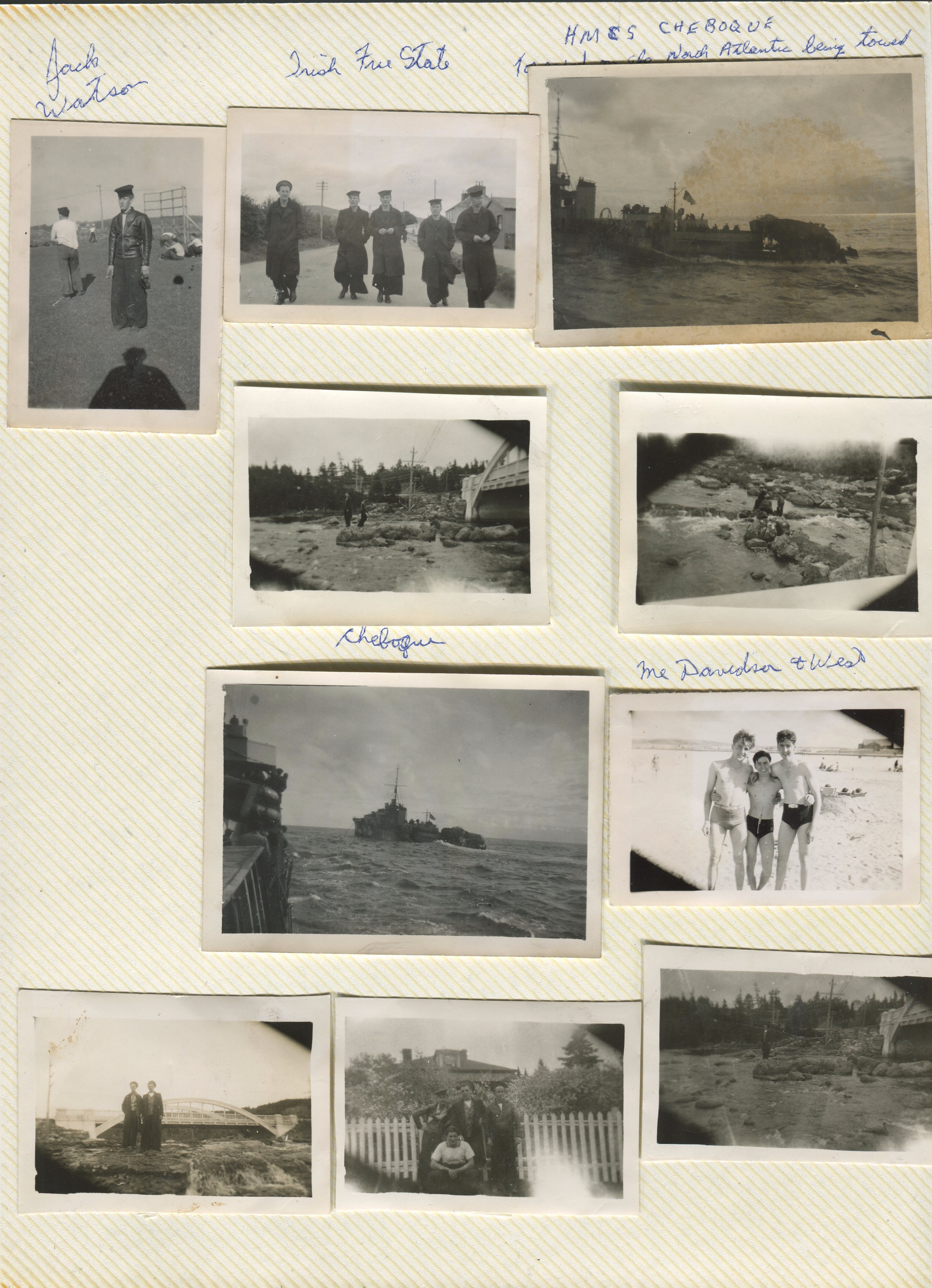 (JM15) John Marklinger, Davidson and West on unknown beach - Bermuda? Port Rush? (JM16) Chuck Rayon - location unknown (JM17) St John's, Newfoundland (JM18) Douglas and Evans on HMCS NEW GLASGOW (JM19) Jack Watson (JM20) Blake and Craig on HMCS NEW GLASGOW (JM21) Jack Watson on HMCS NEW GLASGOW at St. John's, Newfoundland
