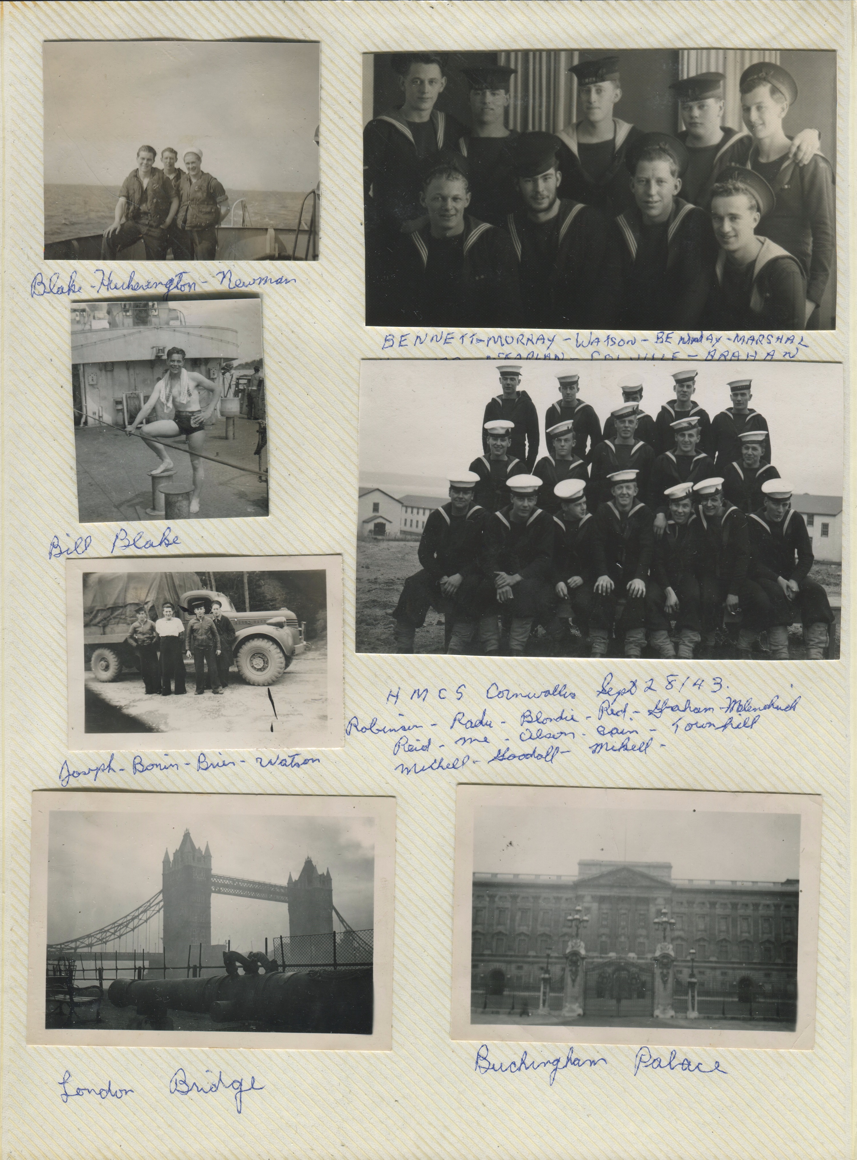 (JM36) Davidson (right) and ?? (JM37) Shaw and Remay (JM38) NEW GLASGOW sailors ashore - location unknown (JM39) NEW GLASGOW sailor ashore with presumably his girlfriend (JM40) London Bridge (JM41) Buckingham Palace (JM42) St. George's Square, London, England