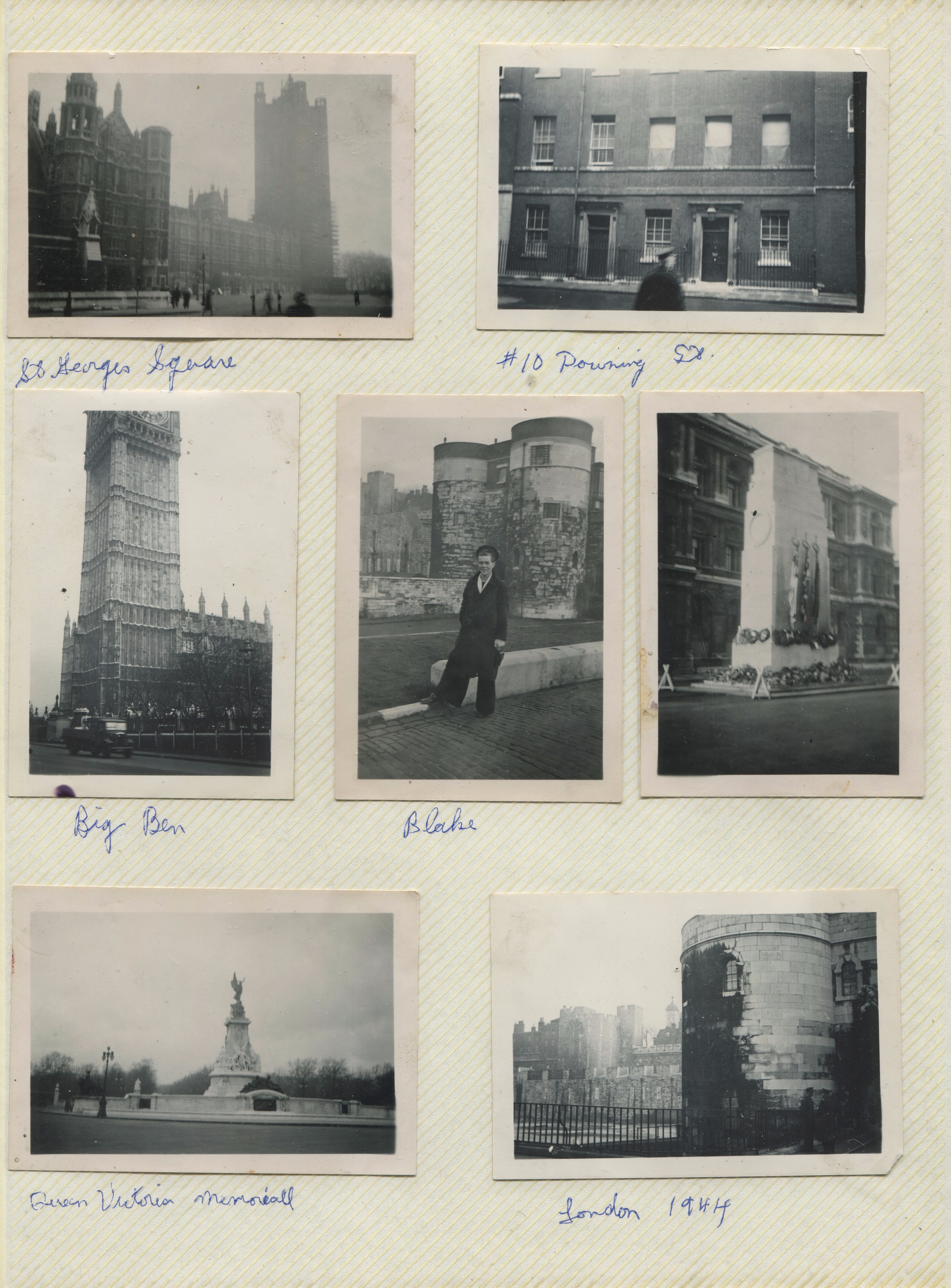 (JM43) 10 Downing Street, London, England (JM44) Big Ben (JM45) Blake ashore in London - 1944 (JM46) Unknown monument - believed to be in London, England (JM47) Queen Victoria Monument, London, England (JM48) London, England - 1944 (JM49) London, England
