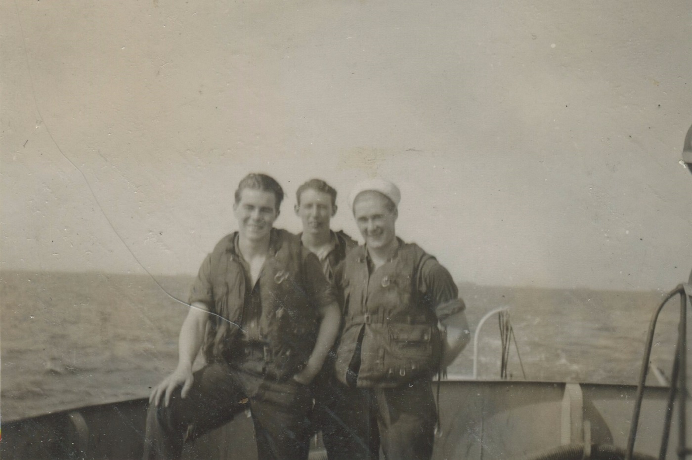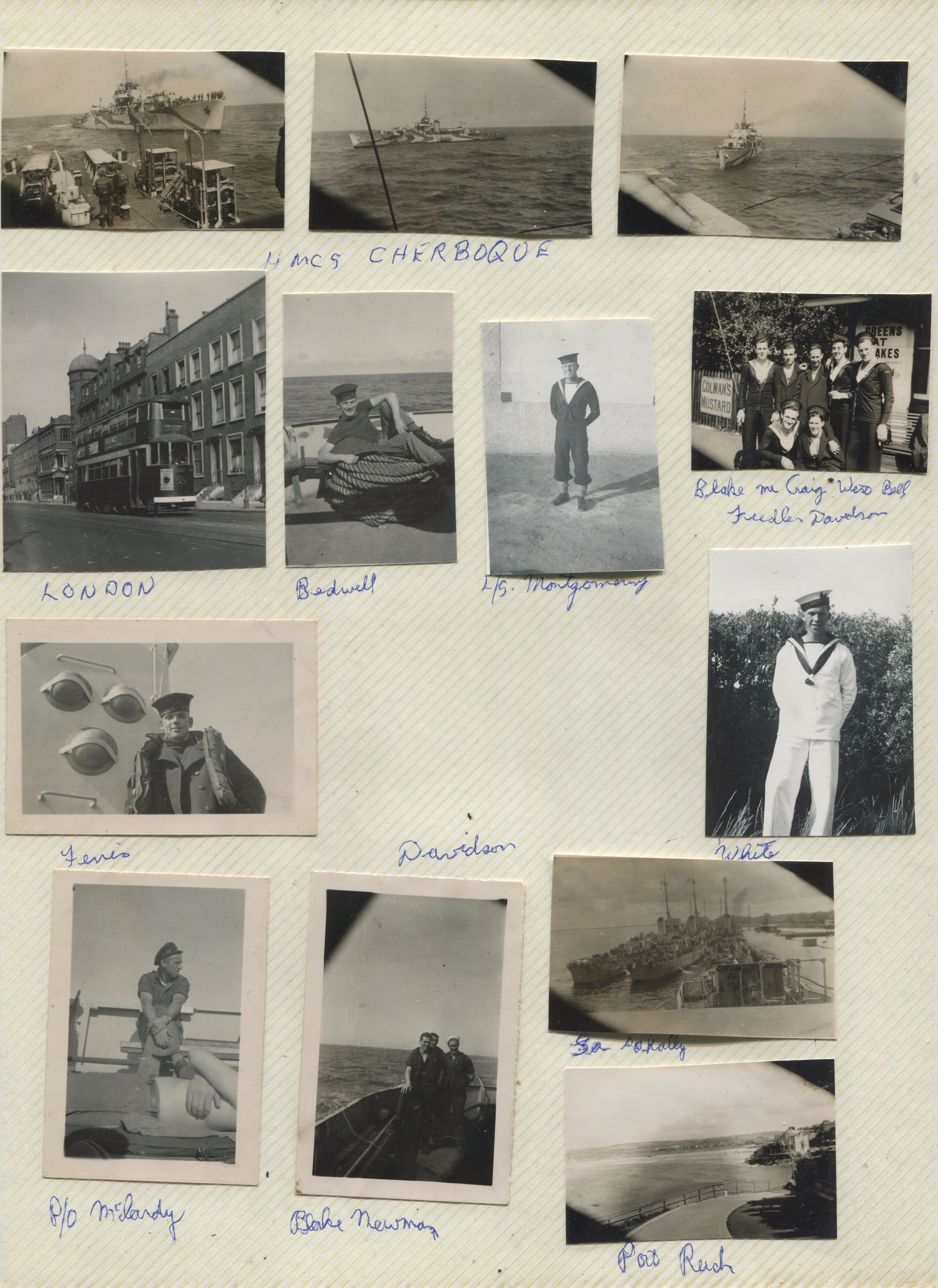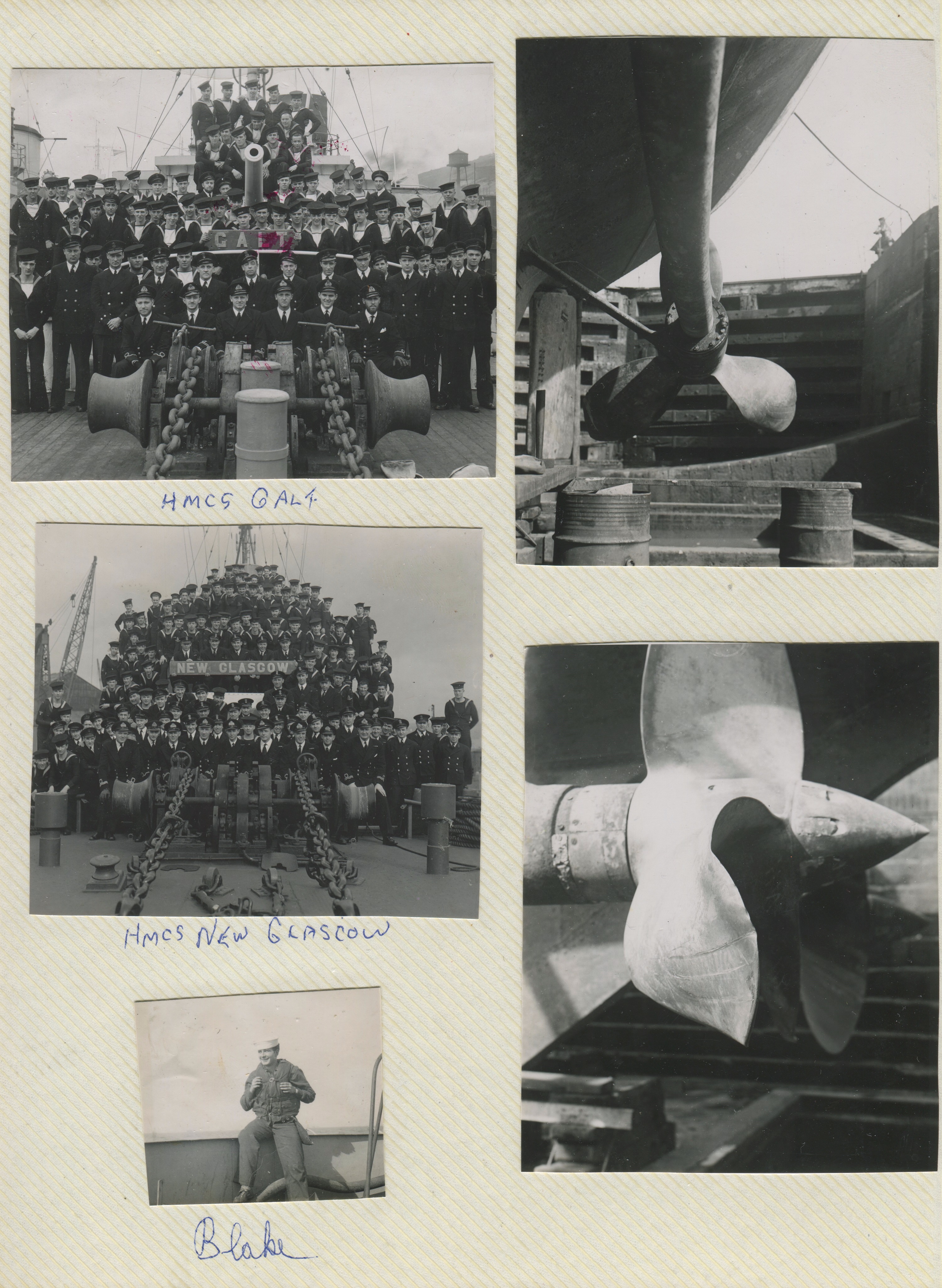 (JM55) Bill Blake on HMCS NEW GLASGOW (JM56) Blake, Heatherington, Newman on HMCS NEW GLASGOW (JM57) Blake, Hetherington, Newman on HMCS NEW GLASGOW (JM58) Gibbs on HMCS NEW GLASGOW (JM59) Unknown ships alongside Lisahally, Northern Ireland (JM60) Bedwell on HMCS NEW GLASGOW (JM61) Ferris on HMCS NEW GLASGOW
