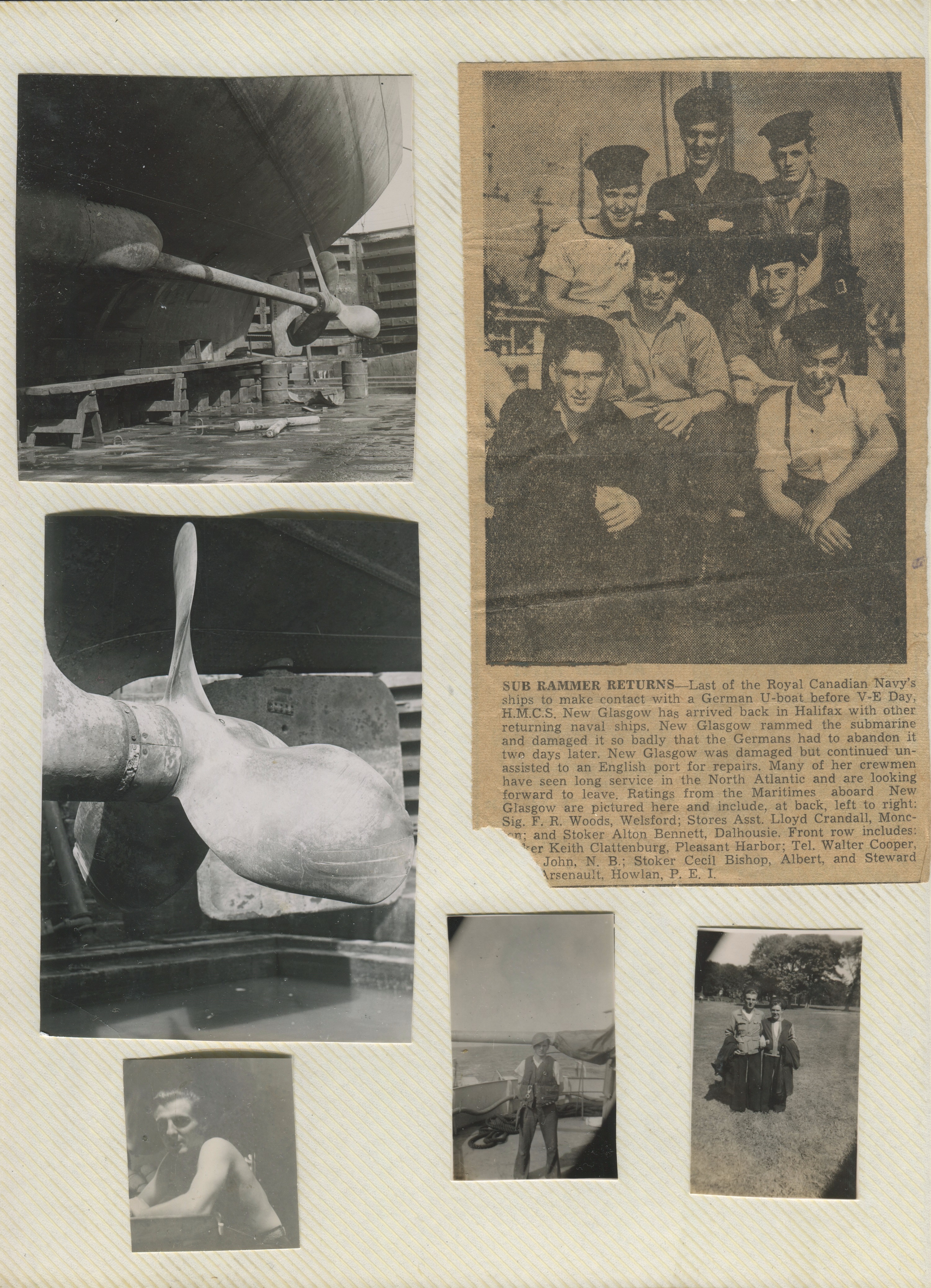 (JM73) Undated newspaper article on HMCS NEW GLASGOW returning to Halifax after the repairs to the her damage from ramming U were completed. Sailors listed in the article: Sig F.R. Woods of Welsford, NB; SA Lloyd Crandall of Moncton, NB; Sto Alton Bennett of Dalhousie, NB; Tel Walter Cooper of Saint John, NB, Sto Cecil Bishop of Albert, NB; and Stwd Arsenault of Howlan, PEI