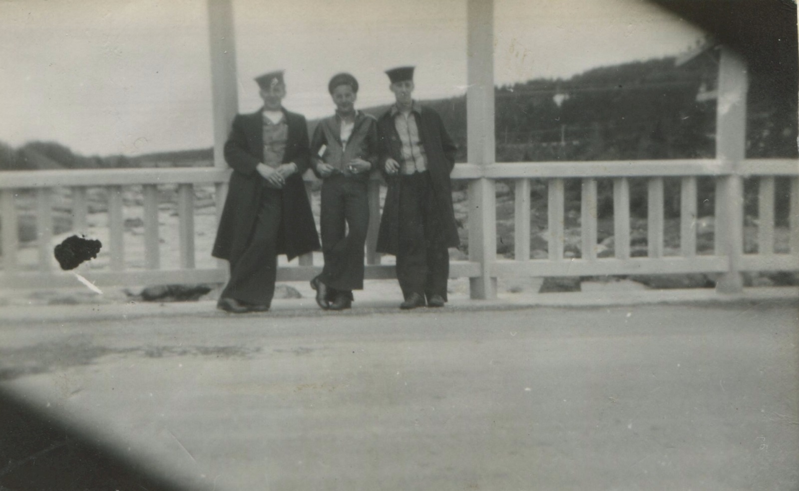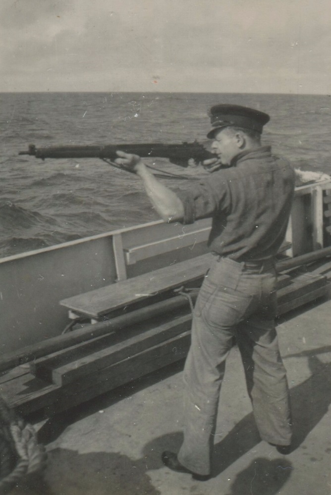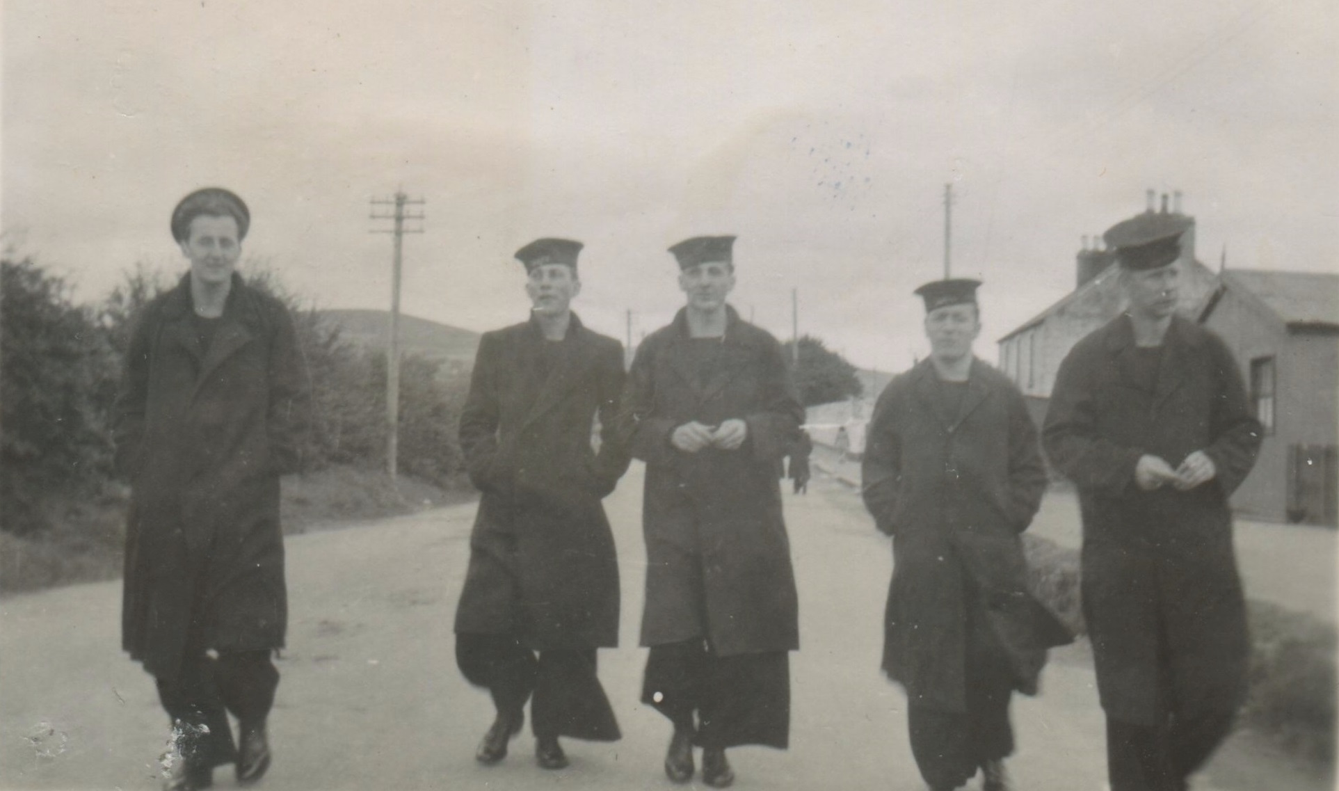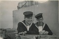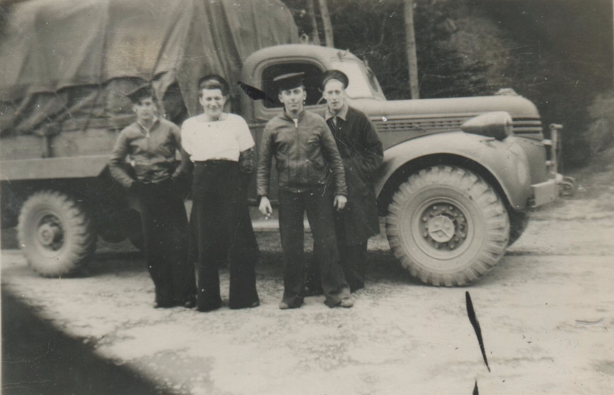(JM22) Back: Watson, John Marklinger, Mackenzie - Front: Marshall, Douglas - Location unknown (JM23) Douglas, John Marklinger, Watson, Fiedler at the Northern Ireland border crossing (JM24) Back: Craig and Fiedler - Front: May and Macpherson (JM25) Back: Blake, John Marklinger, Craig, West, Bell - Front: Fiedler, Davidson (JM26) Bedwell standing jetty sentry - location unknown (JM27) Unidentified sailor in a mess deck on HMCS NEW GLASGOW (JM28) Newman