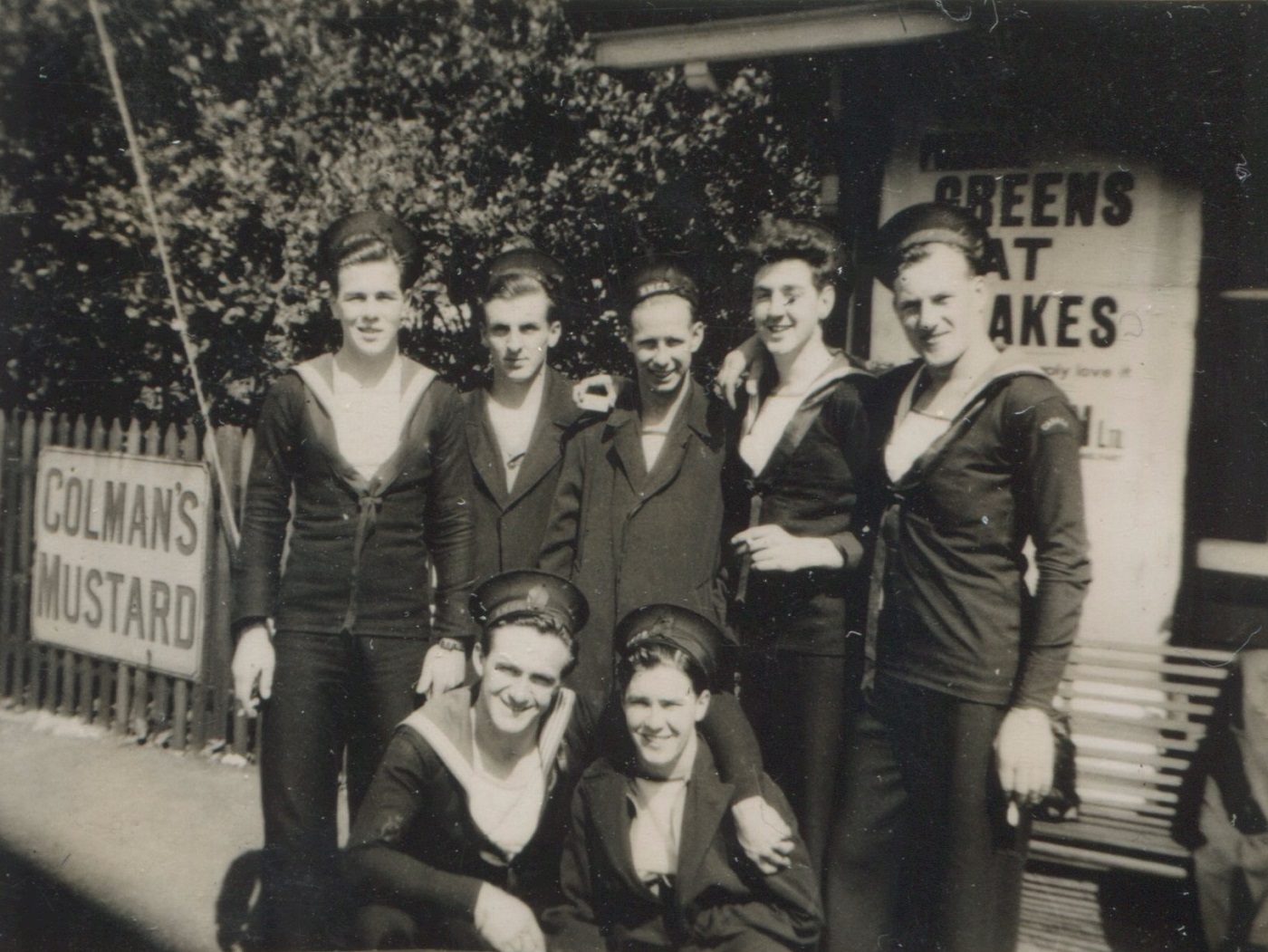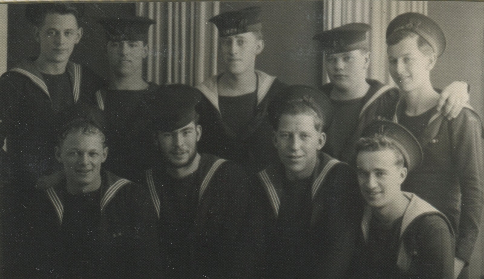 (JM90) - Group of sailors - it is not known if they are from HMCS NEW GLASGOW Rear: Bennett, Morray, Watson, Bennay, Marshall Front: unknown, McEarlan, Colville, Brahan