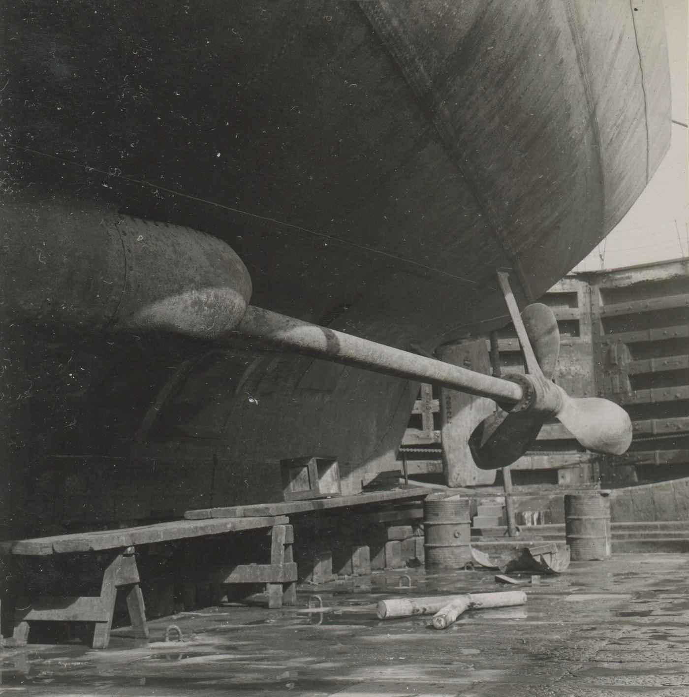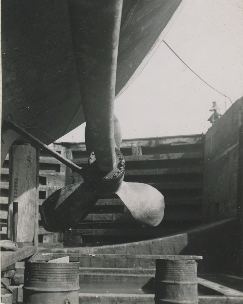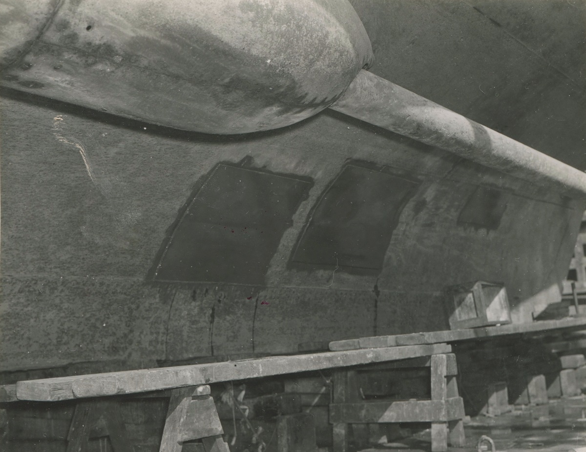 (JM67-JM72) HMCS NEW GLASGOW in dry dock for repairs after ramming U-1003 on 20 Mar 1945 just north of Loch Foyle
