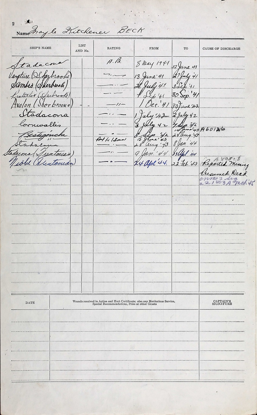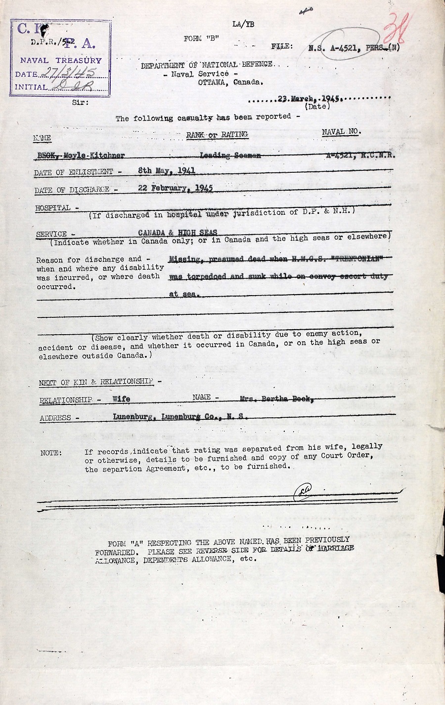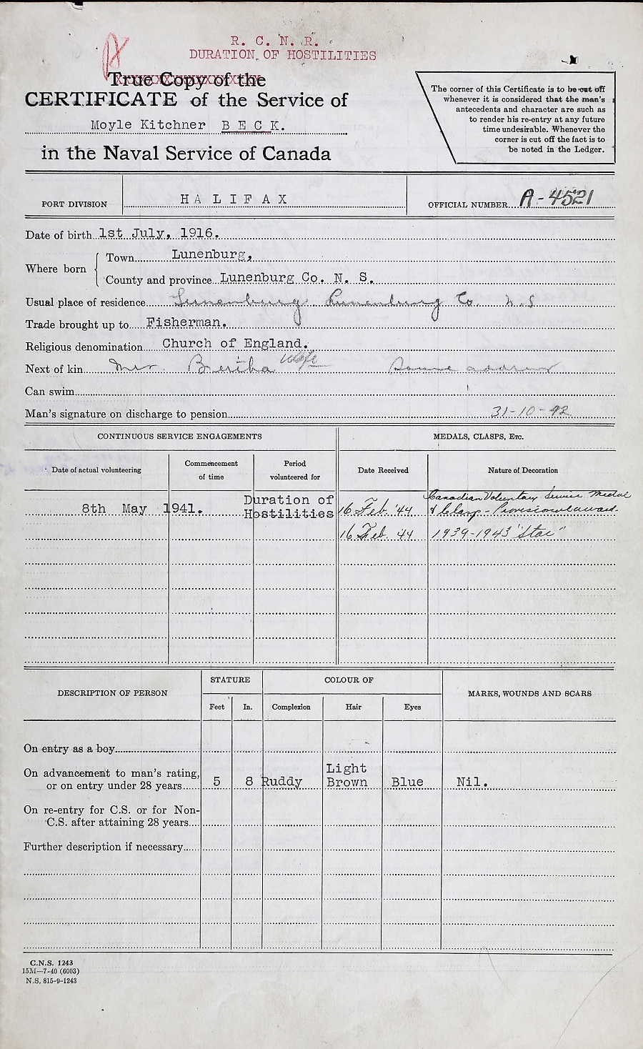BECK, Moyle Kitchener, LS, A4521, RCNR, MPK - 22 Feb 1945, HMCS TRENTONIAN - Son of James Enos W. Ada Belle Beck; husband of Bertha E. Beck, all of Lunenburg, NS.
