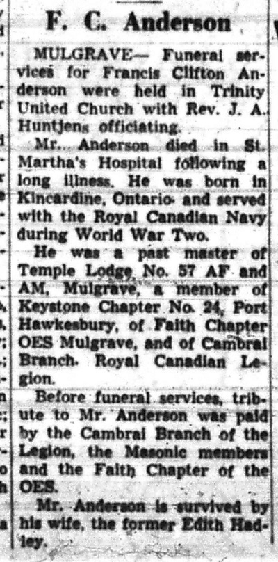 ANDERSON, Francis Clifton - Mulgrave. Funeral services for Francis Clifton Anderson were held in Trinity United Church with Rev. J.A. Huntjens officiating.