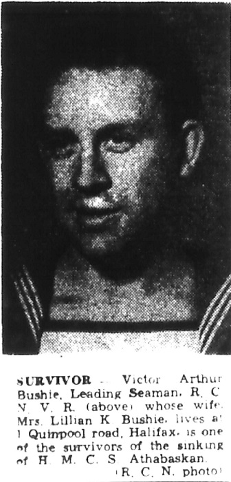Article on Victor Bushie surviving the sinking of HMCS Athabaskan G07 Halifax Morning Chronicle, Wed, 08 May 1944 Researched by George Newbury