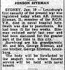 SITEMAN, Jonson - Sydney. Jan 10 - Louisburg's first casualty of the present war was registered today when AB Jonson Siteman, 21, member of the RCNVR, died in naval hospital here. Death was due to pneumonia. He had been ill for two weeks. Siteman enlisted early last year and had been stationed for the greater part of the time in this city. Surviving are his grandparents, Mr. and Mrs. George Siteman, and one brother, George Siteman, Louisburg. The body will be forwarded to the seaport town where funeral service will be held with naval honors.