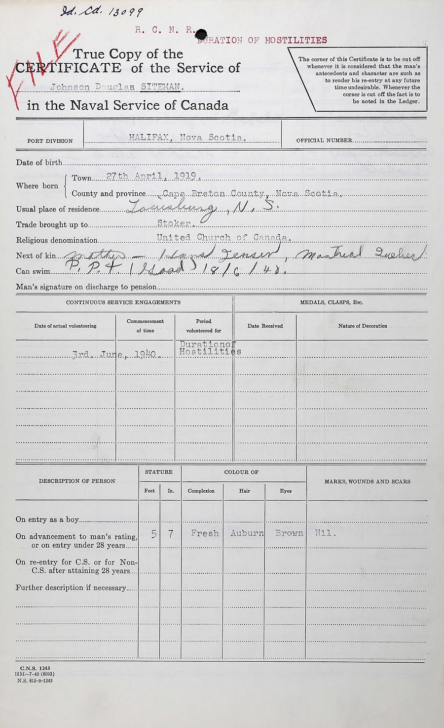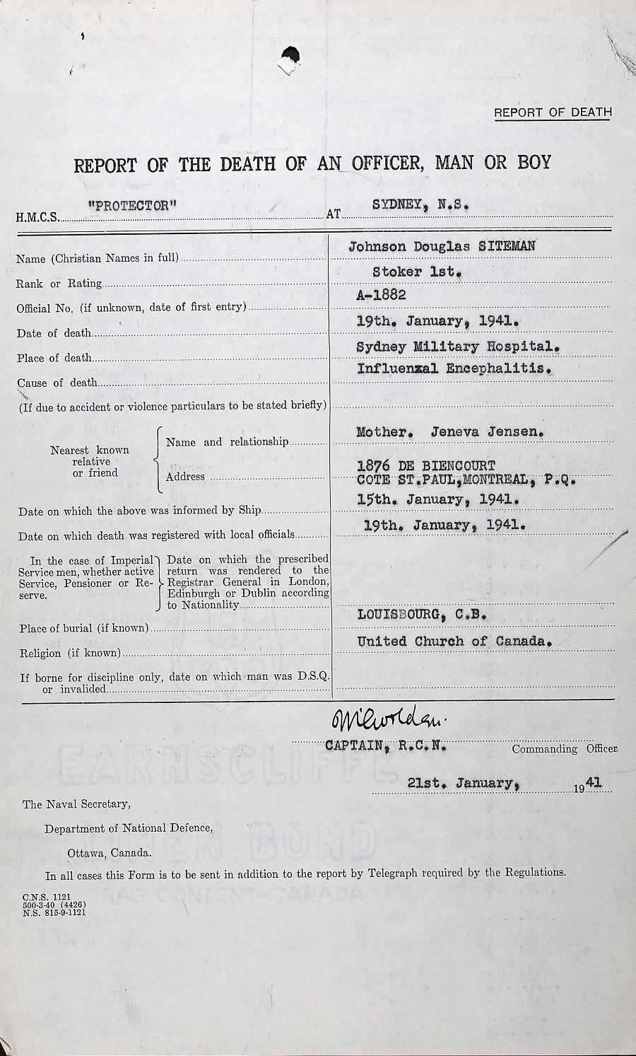 SITEMAN, Johnson Douglas, Stoker 1c, A1882, RCNR, died - 19 Jan 1941, HMCS PROTECTOR - Son of Mrs. Genora Jensen of Montreal and the late Wallace Fred Siteman (died Mar 1933).