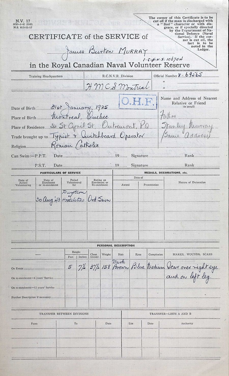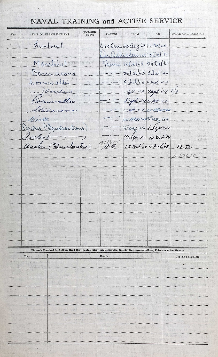 Ships served in: HMCS MONTREAL - Enlisted 30 Aug 1943. Commenced active service 13 Oct 1943 HMCS DONNACONA - Served in DONNACONA 26 Oct 1943 - 08 Feb 1944 HMCS CARIBOU - Served in CARIBOU -1 Apr 1944 - 07 Apr 1944 while in training at HMCS Cornwallis HMCS HUMBERSTONE - Drafted to HUMBERSTONE 06 Sep 1944 as an OS, RCNVR. Commissioning crew. Rated AB 13 Oct 1944