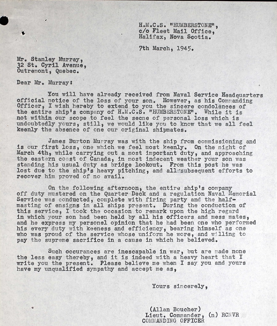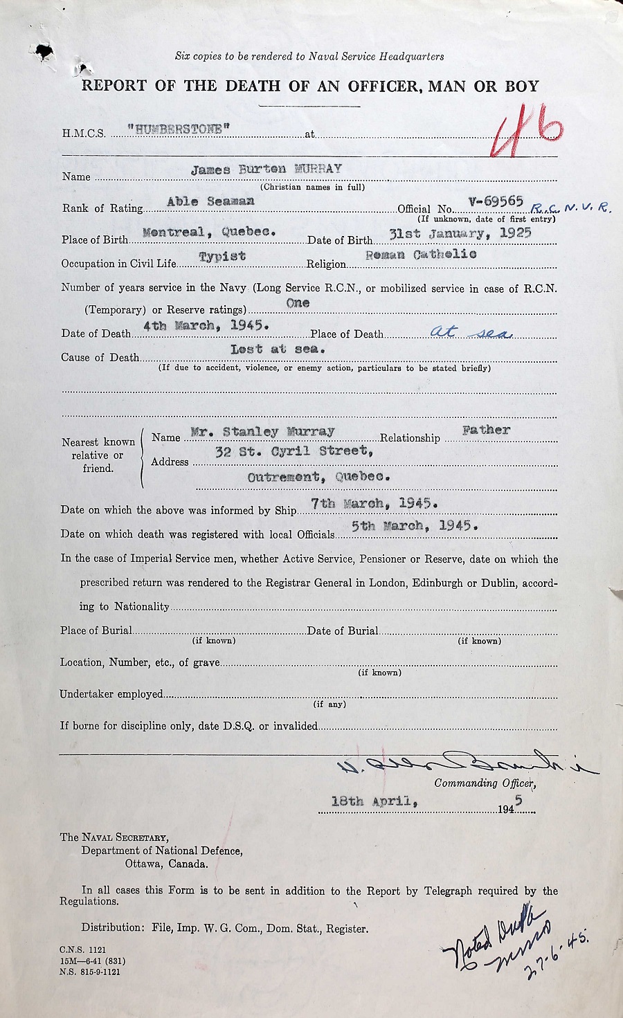 MURRAY, James Burton, AB, V69565, RCNVR, MPK - 04 Mar 1945, HMCS HUMBERSTONE - Son of Stanley and Flossy Pear Murray, of Montreal, QC.