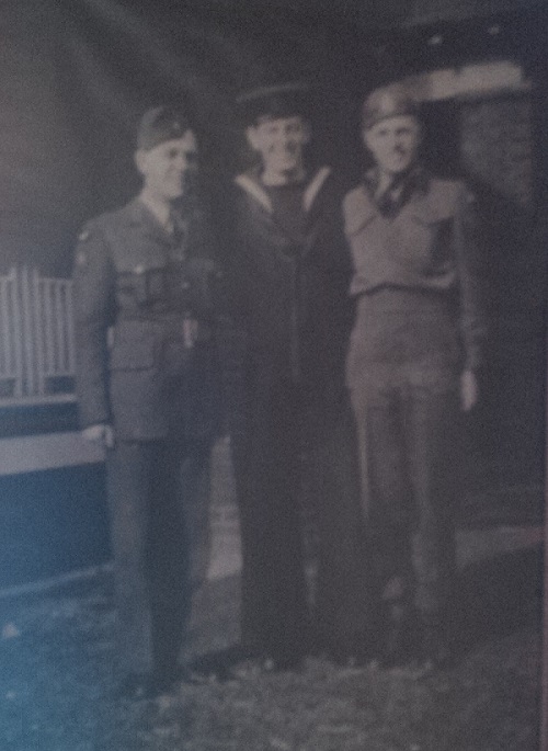 (1) (left) Bruce Crawford (2) (right) Bruce Crawford (centre) with his two brothers - one air force, one army in front of his parents house in Weston (Toronto), ON